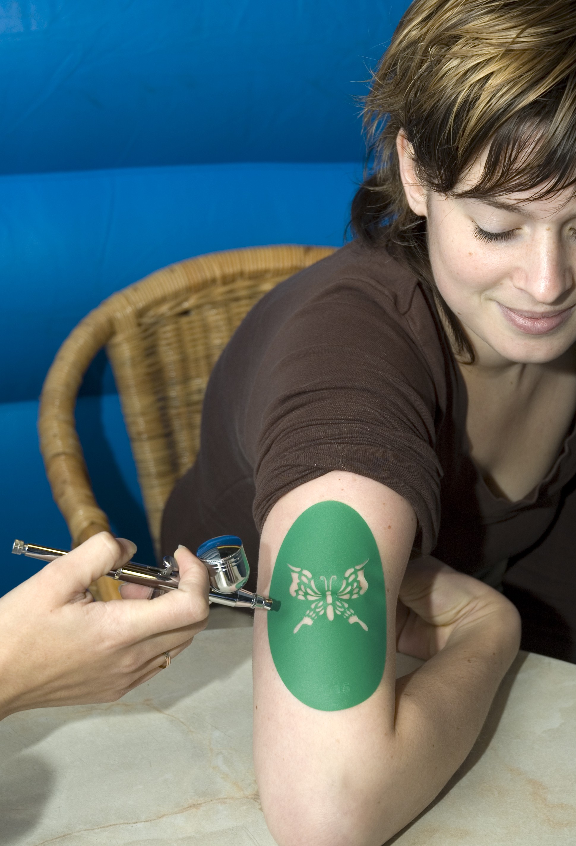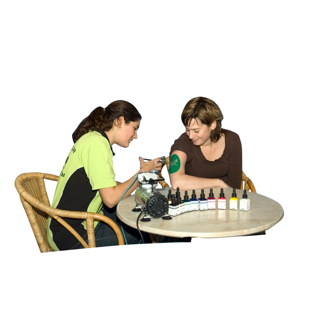 Met de Airbrush Tattoo Shop kan iedereen gemakkelijk op een huid- en kindvriendelijke manier afwasbare tattoos maken. De Airbrush is gemakkelijk aan te sluiten en de inkt dat door het apparaat wordt gebruikt is dermatologisch getest en goedgekeurd. Om als beginner in de tattoo wereld ook de mooiste tattoos te kunnen zetten wordt onze Airbrush Tattoo Shop geleverd met vele prachtige en inspuitbare voorbeelden. Deze voorbeelden kunnen op de huid worden geplaatst en worden ingekleurd. Op deze manier zal zowel jong als oud de tattoo krijgen die hij/zij wilt (van bijvoorbeeld Minnie Mouse en prinsessen tot en met stoere piraten en voetbal gerelateerde plaatjes), alles is beschikbaar. Huur dit prachtige en uniek apparaat en zet de meest mooie en spectaculaire afwasbare tattoos. Super voor zowel kinderen als volwassenen.