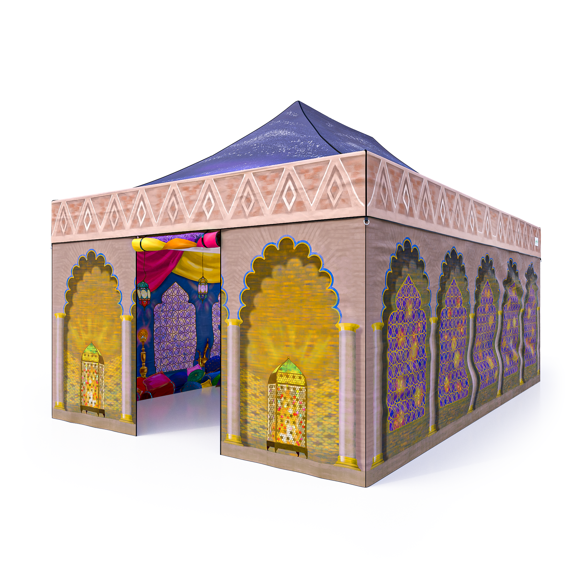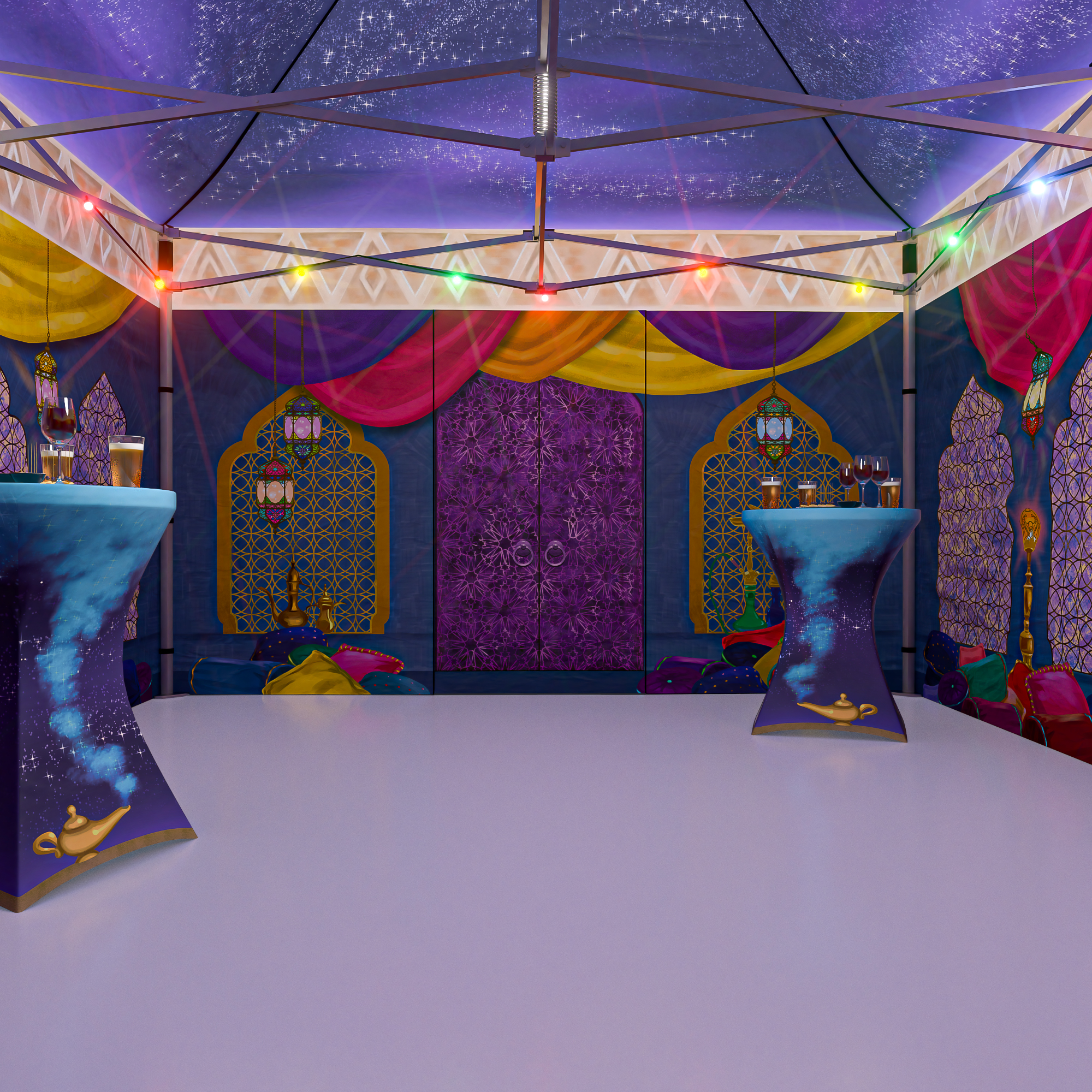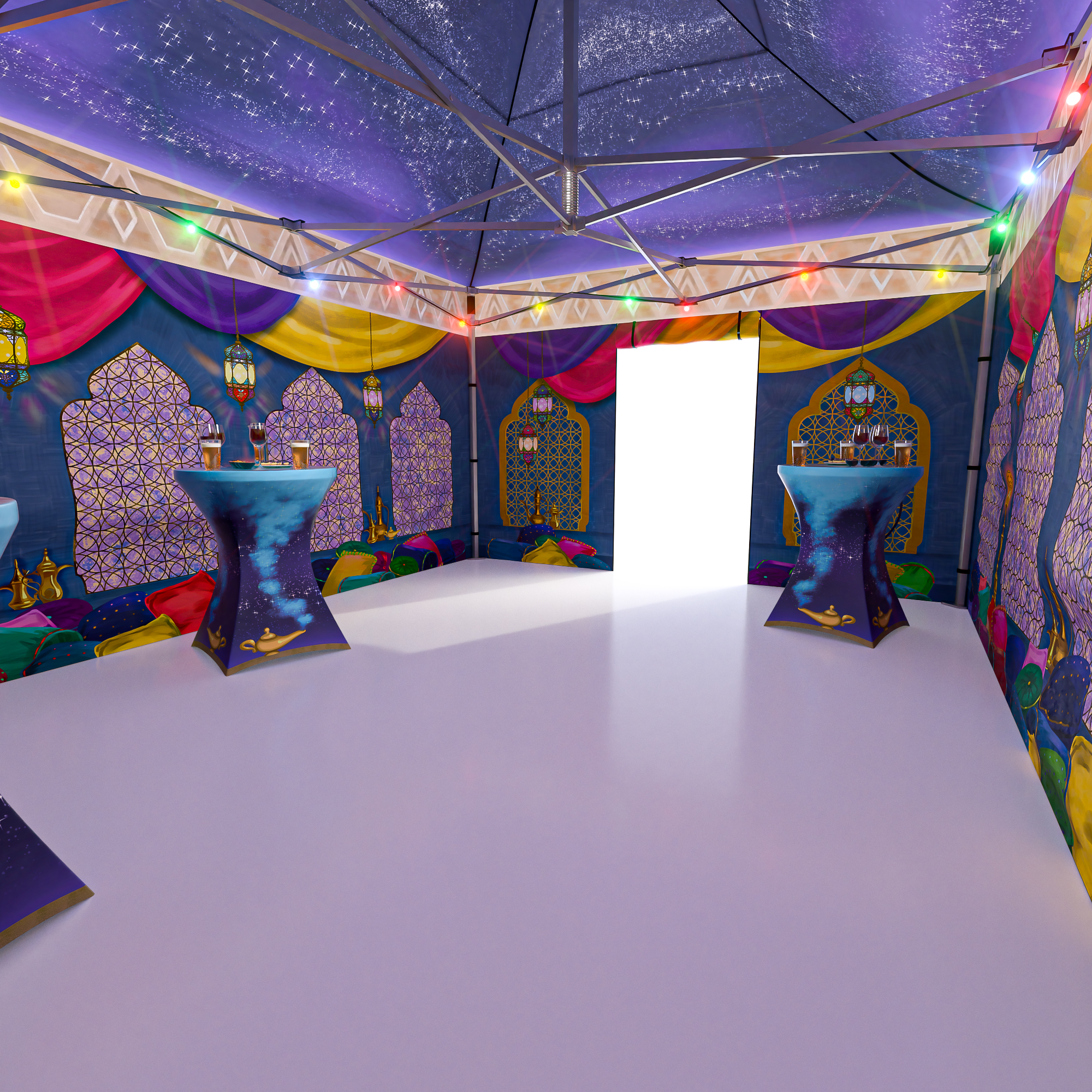 Stap binnen in een wereld van duizend-en-een-nacht met onze Arabische easy up tent. Het prachtige Arabische design, zowel van binnen als van buiten, roept direct een betoverende sfeer op. Of je nu een bruiloft, themafeest of cultureel evenement organiseert, deze tent voegt een vleugje mysterie en allure toe aan elke gelegenheid. Laat je gasten betoveren door de unieke thematische beleving en dompel ze onder in de rijke cultuur van het Oosten.
