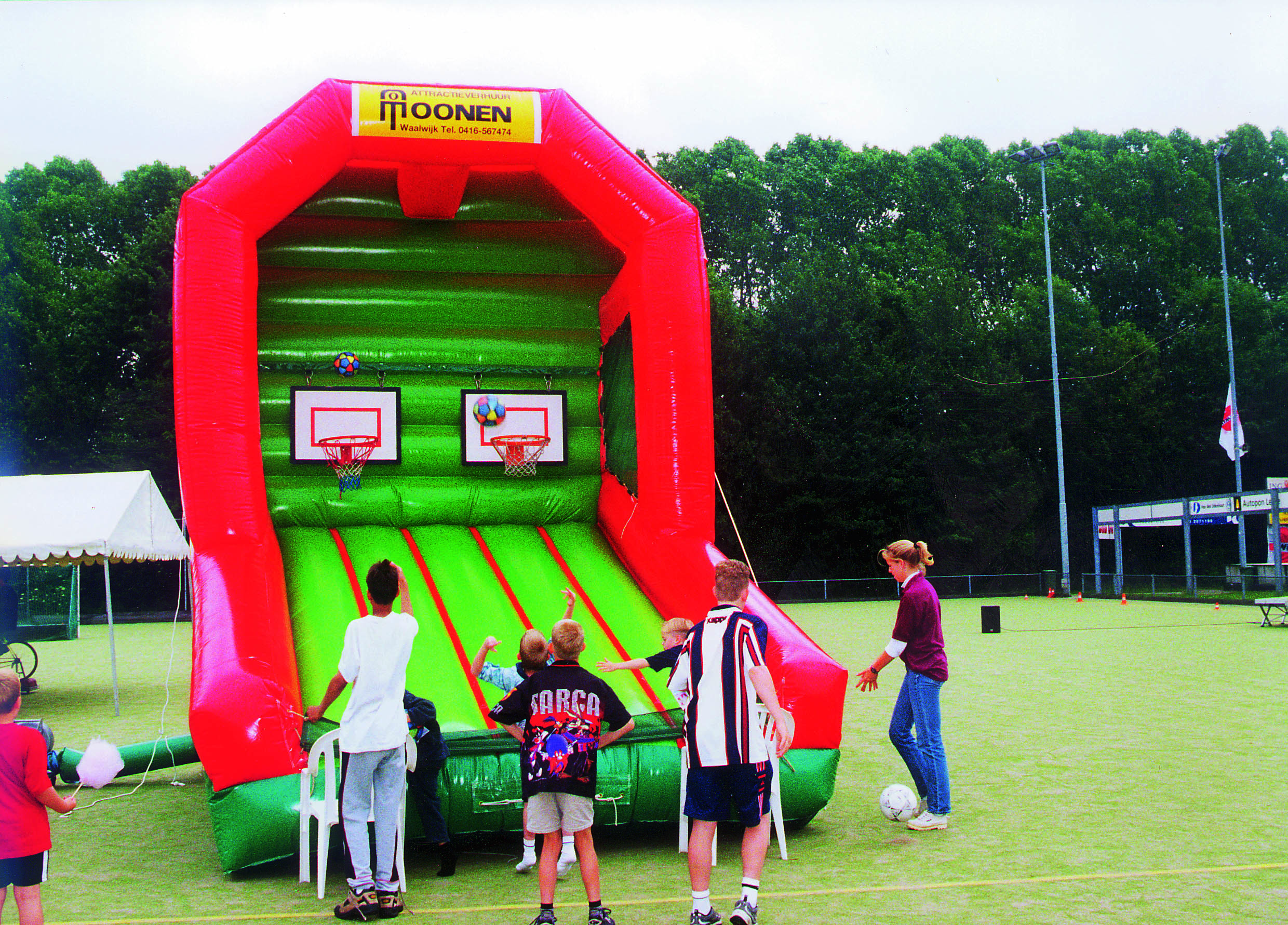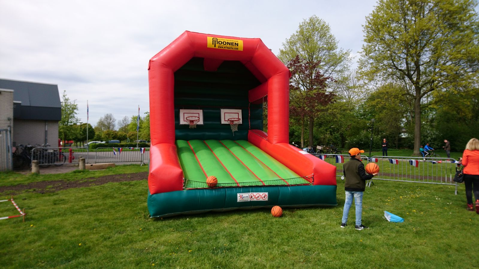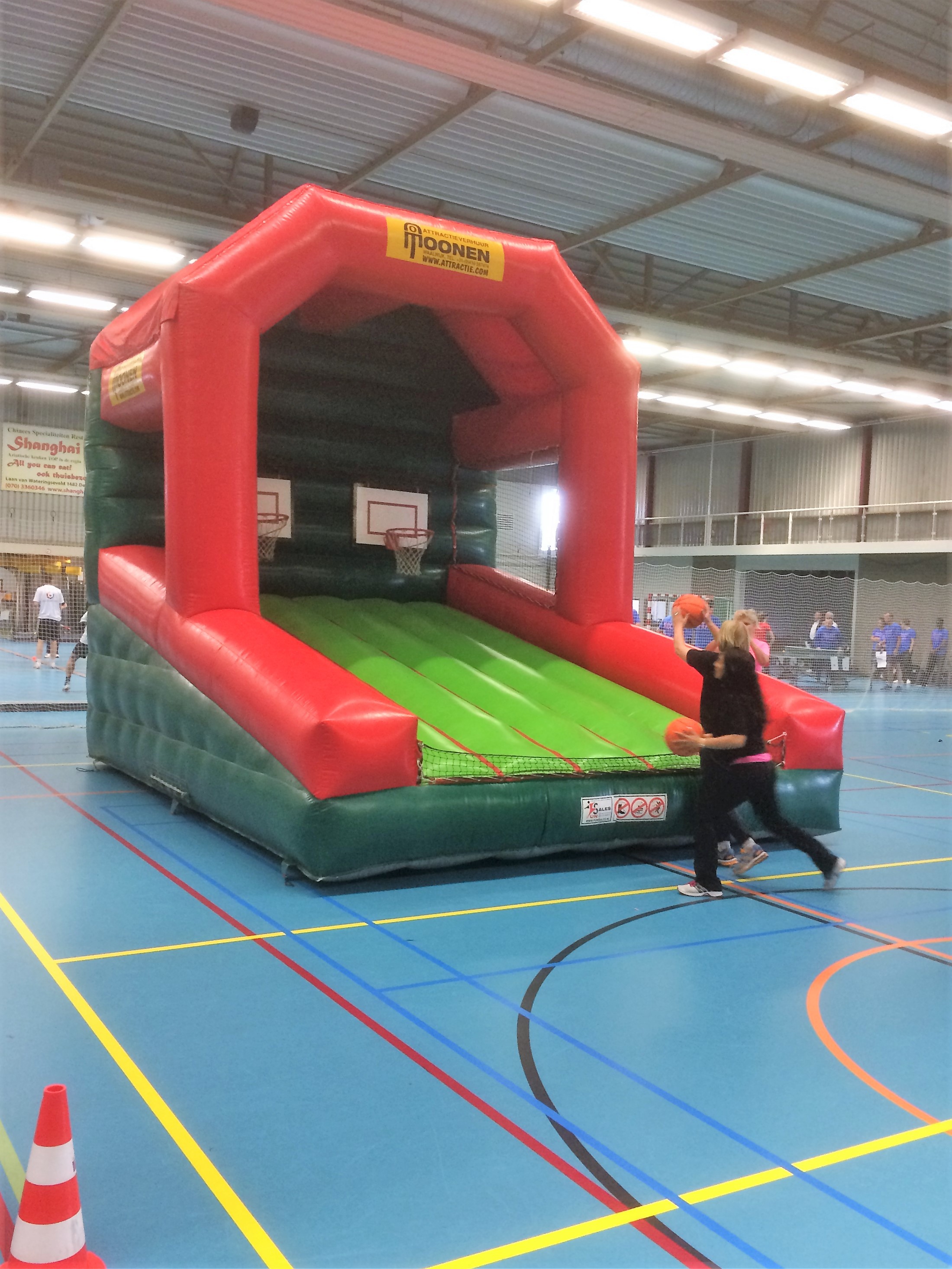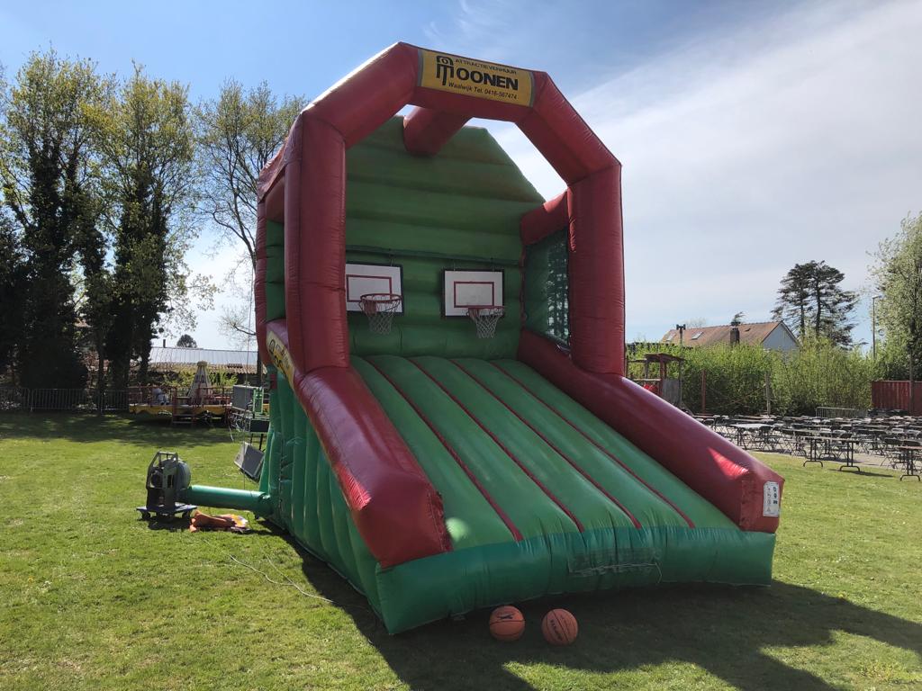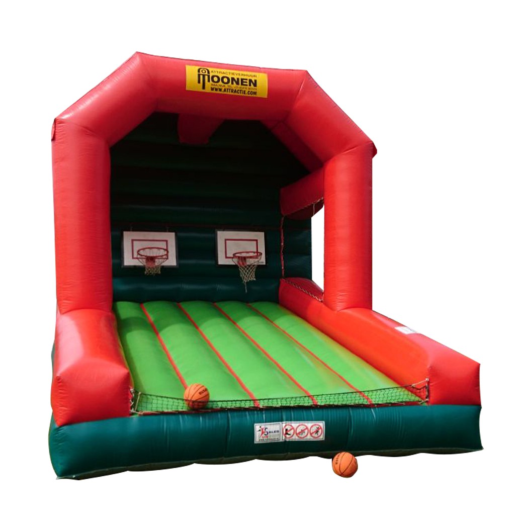 Basketbal werpen, een leuk en toegankelijk spel voor jong en oud! Dit grote luchtkussen biedt plaats voor 2 baskets waardoor 2 personen/ teams tegelijk gebruik kunnen maken van de attractie. Hierdoor is er de mogelijkheid om er een wedstrijd van te maken! Lukt het jou om te scoren? Het vangnet dat bevestigd is aan de onderzijde zorgt ervoor dat de basketballen binnen de attractie blijven.