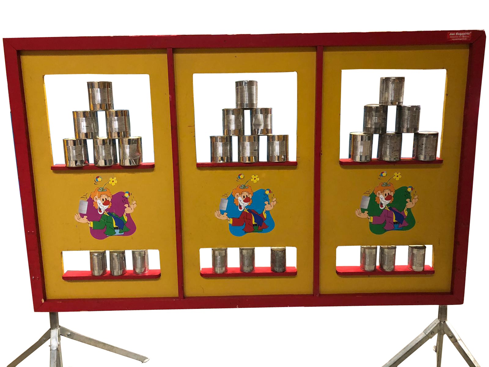 Probeer zoveel mogelijk blikjes om te gooien met de meegeleverde balletjes! Biedt plaats aan drie deelnemers. Geleverd op statief.