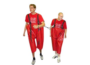 Komische loopbroek, koppelbaar. Mogelijkheid om met 2 tot 10 gekoppelde broeken te lopen.