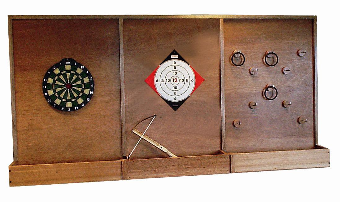 Heel leuk bord met 3 spelen, van daar de naam "Drieluik" ; Darten + kuisboog kleef + ring werpen.