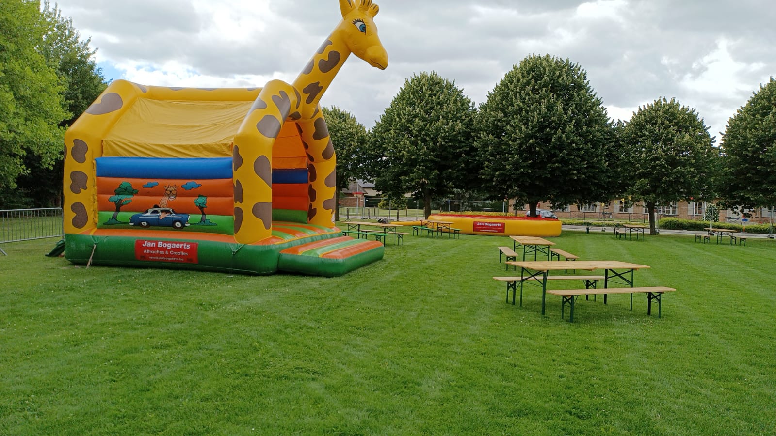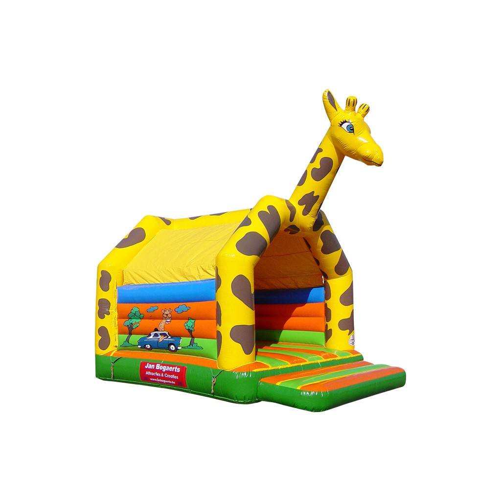 Ga op safari met dit leuke giraffe springkussen. Het springkussen is een echte eyecatcher door de vele felle kleuren en de giraffe die overal met kop en schouders bovenuit steekt. Bezorg kinderen een onvergetelijke dag vol springplezier met dit springkussen. Het is uitermate geschikt voor verschillende evenementen en verjaardagsfeestjes.