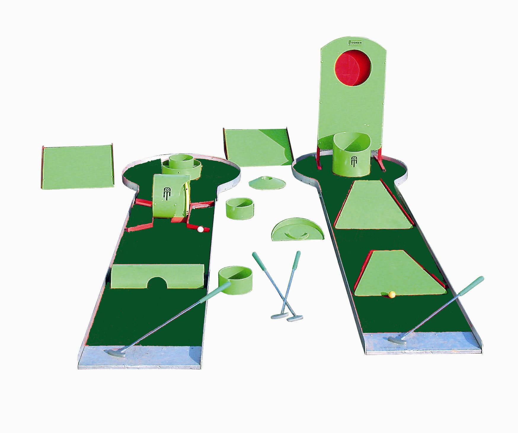 Wilt u midgetgolf spelen maar heeft u niet veel ruimte beschikbaar? Dan is deze midgetgolfbaan ideaal! Het is één baan maar u kunt hem veranderen door de verschillende opzetstukken.