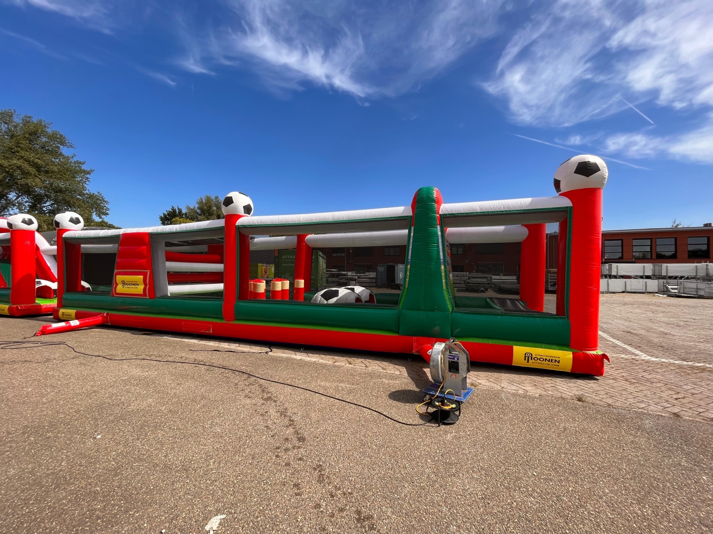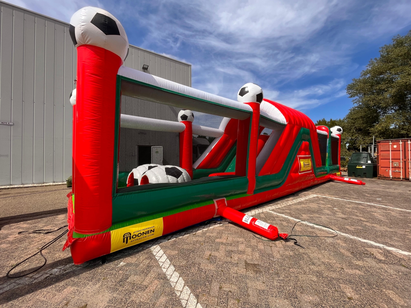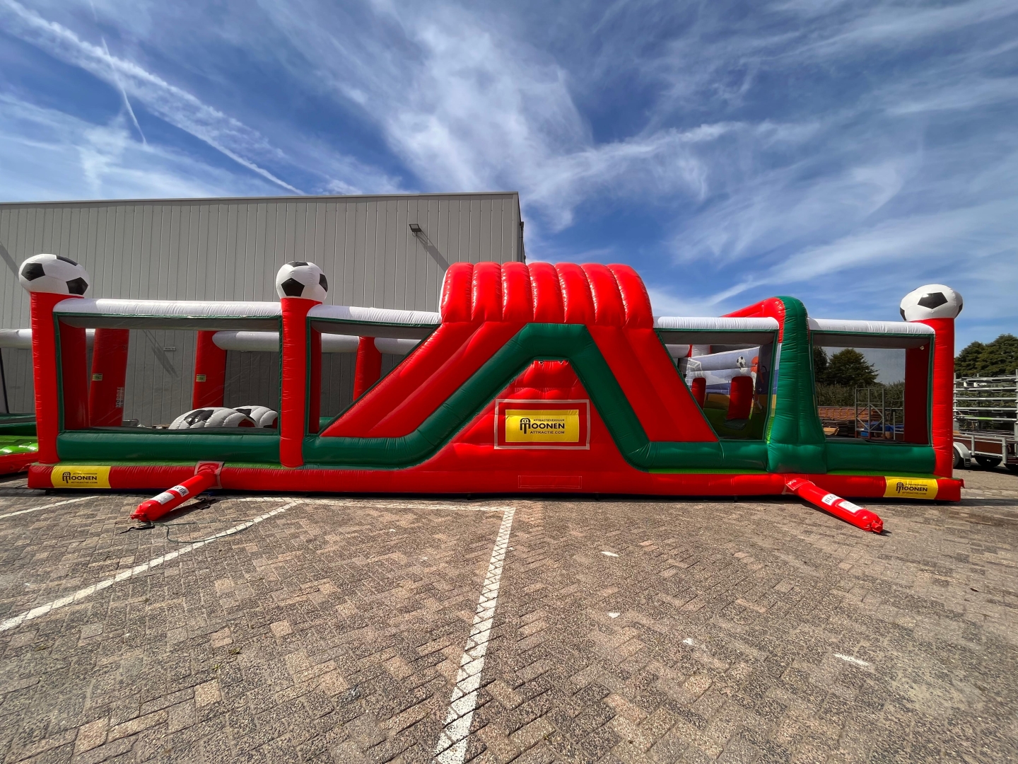 Heb je binnenkort een evenement wat met voetbal te maken heeft of vind je deze stormbaan er gewoon gaaf uitzien? Huur de hindernisbaan voetbal dan voor gegarandeerd veel plezier. Deze hindernisbaan zelf bestaat uit 2 delen maar is gemakkelijk in elkaar te zetten doormiddel van een rijgsysteem wat aan het kussen bevestigd zit. Als je deze attractie in spelvorm gaat gebruiken werkt hij als volgt. Je gaat als eerste het net onder waarna je een klein gat doorspringt. Daarna klim je de steile wand op doormiddel van de blokjes trap en glijd je naar beneden via het glijzeil. Daarna ga je door de voetbaltunnel en via het 2e gat naar de opblaaspionnen. Hier ren je doorheen en spring je door de pilaren heen. Nog even snel onder het net door en je hebt de 30 meter lange hindernisbaan overleeft. Deze attractie is ideaal om te gebruiken als zeskamp spel of gewoon om de mensen lekker te laten springen en klauteren.