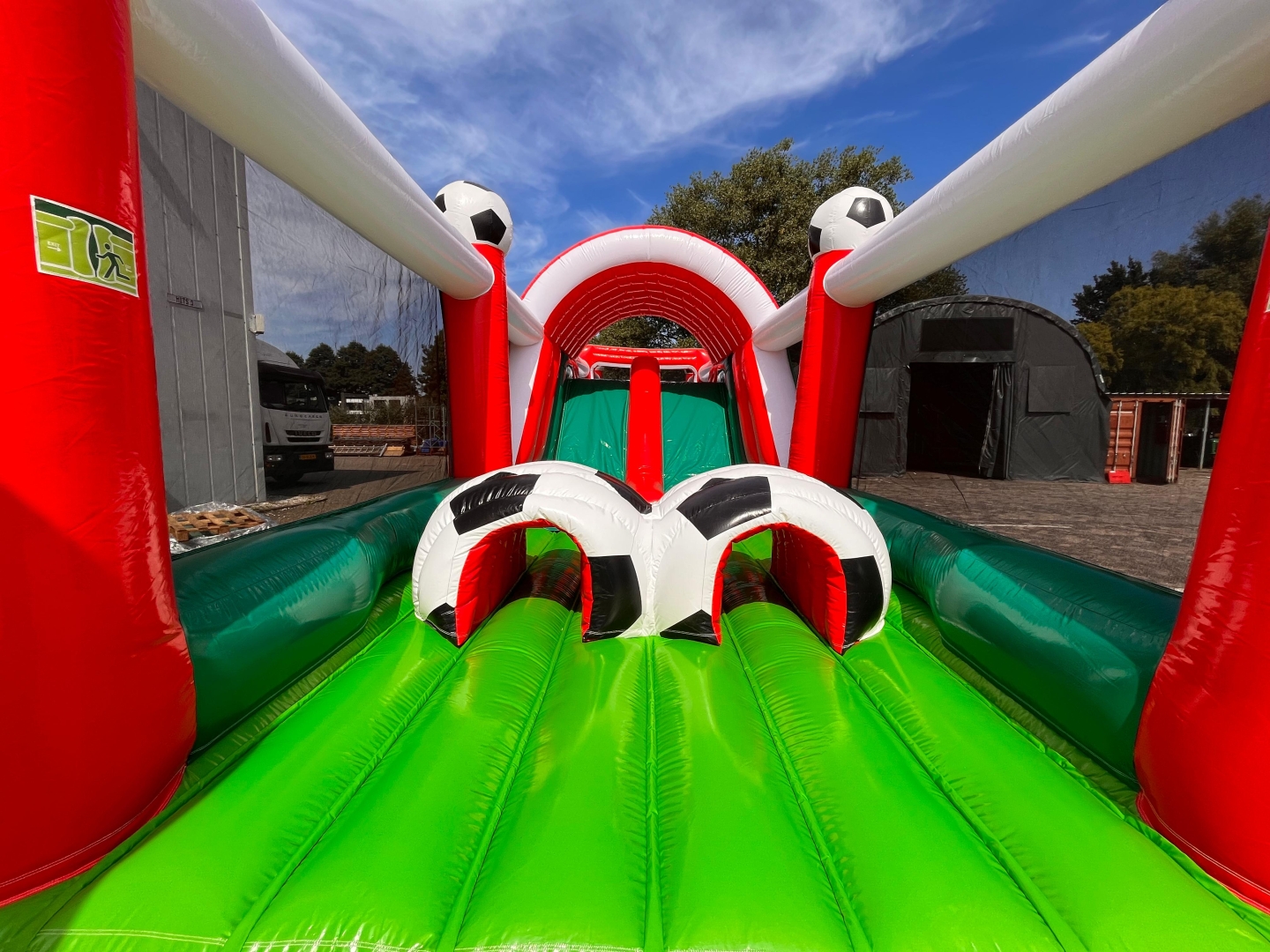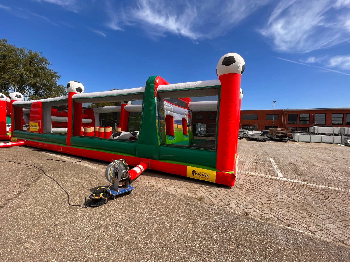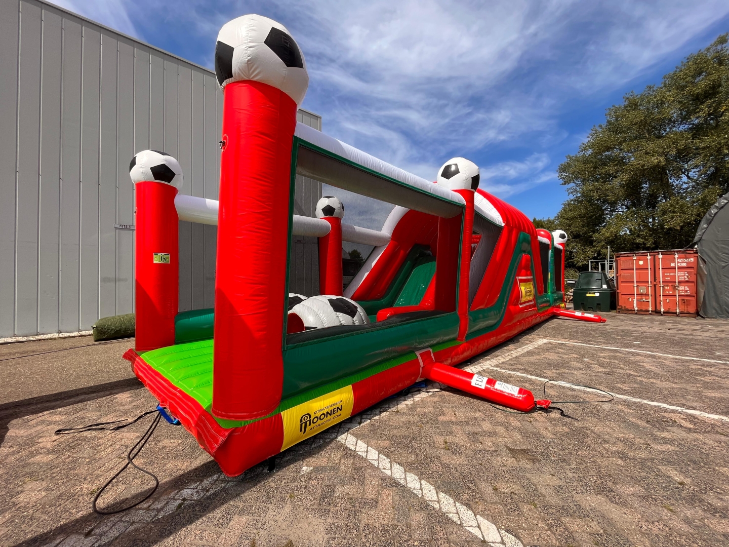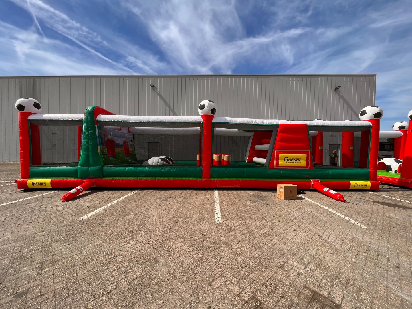 Heb je binnenkort een evenement wat met voetbal te maken heeft of vind je deze stormbaan er gewoon gaaf uitzien? Huur de hindernisbaan voetbal dan voor gegarandeerd veel plezier. Deze hindernisbaan zelf bestaat uit 2 delen maar is gemakkelijk in elkaar te zetten doormiddel van een rijgsysteem wat aan het kussen bevestigd zit. Als je deze attractie in spelvorm gaat gebruiken werkt hij als volgt. Je gaat als eerste het net onder waarna je een klein gat doorspringt. Daarna klim je de steile wand op doormiddel van de blokjes trap en glijd je naar beneden via het glijzeil. Daarna ga je door de voetbaltunnel en via het 2e gat naar de opblaaspionnen. Hier ren je doorheen en spring je door de pilaren heen. Nog even snel onder het net door en je hebt de 30 meter lange hindernisbaan overleeft. Deze attractie is ideaal om te gebruiken als zeskamp spel of gewoon om de mensen lekker te laten springen en klauteren.