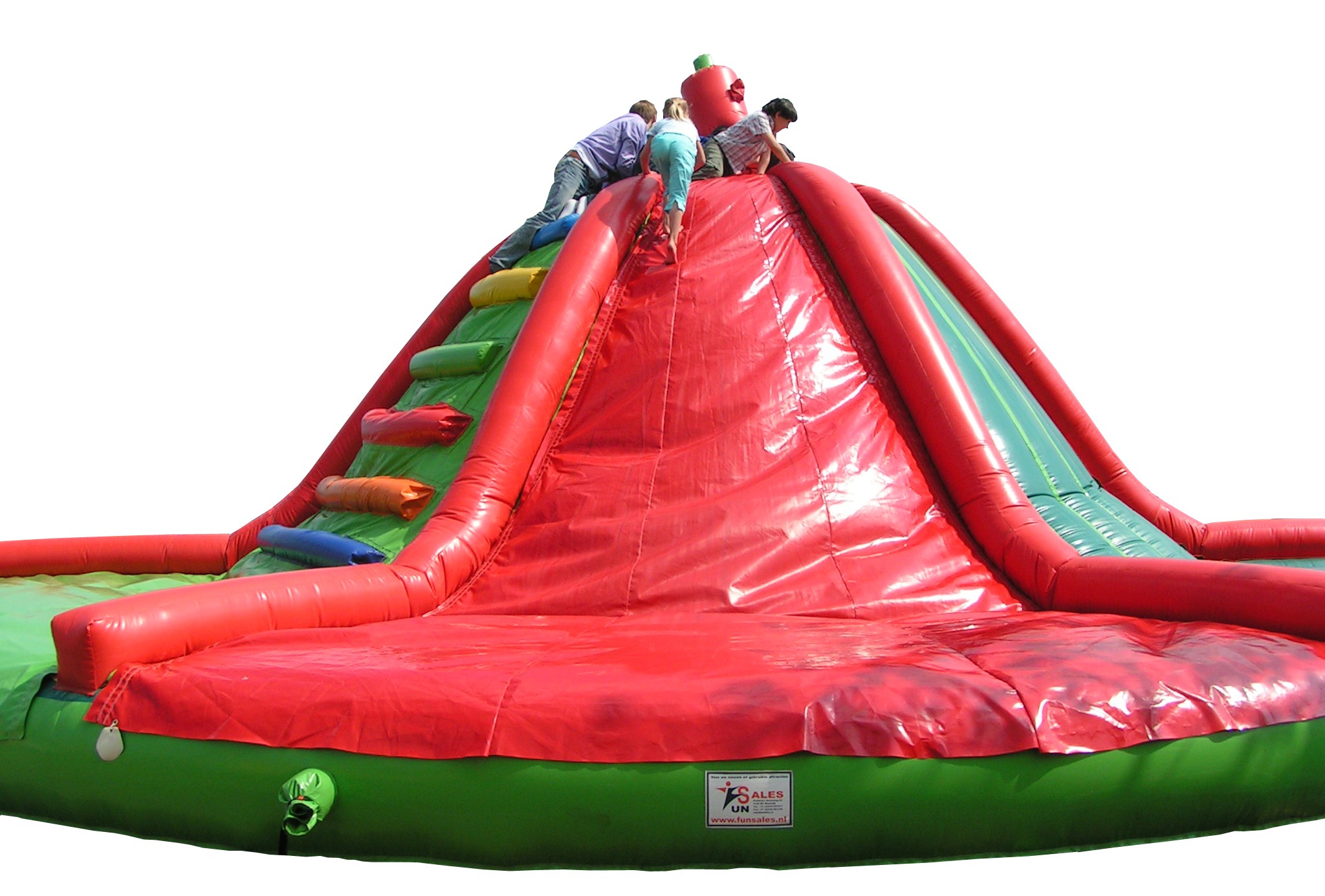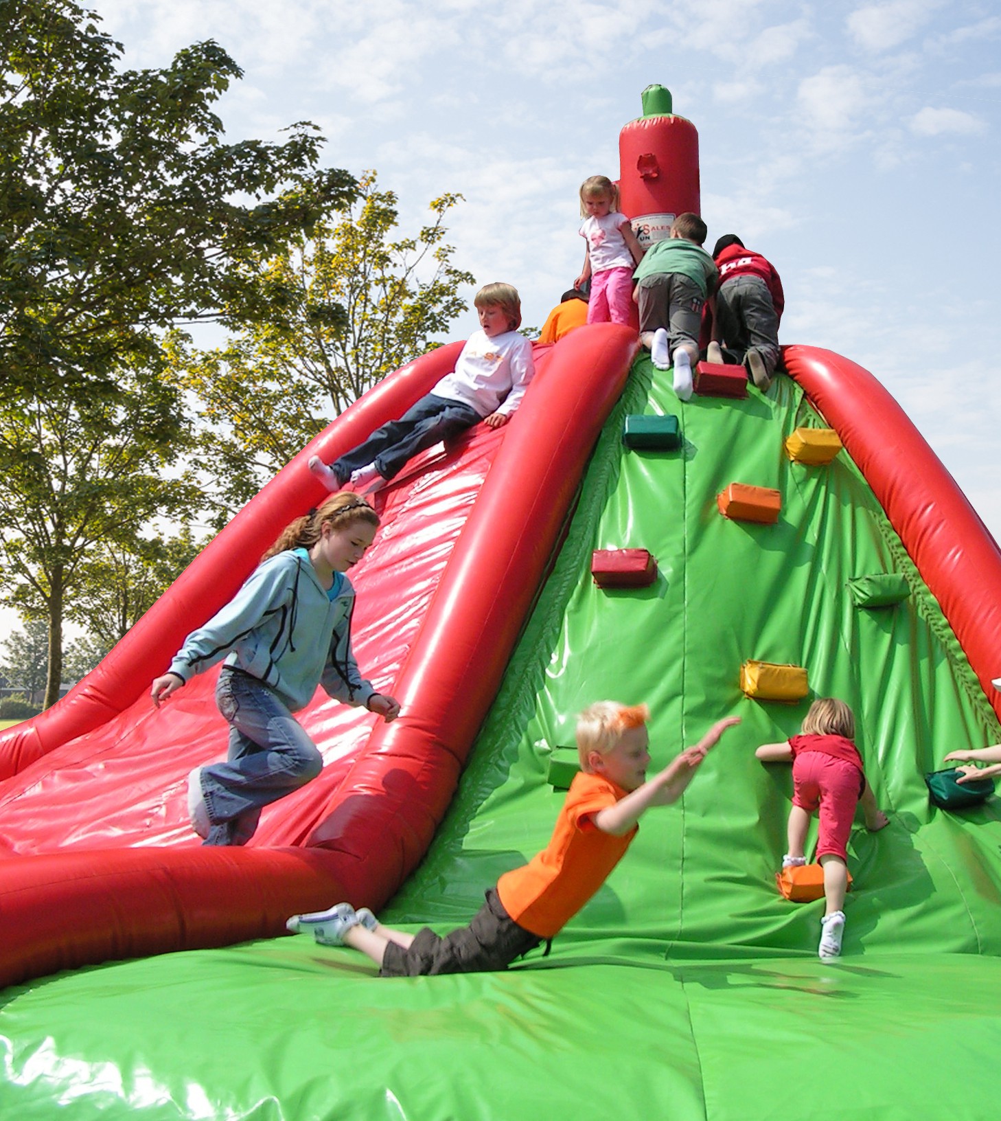 Wil je een klim en glijbaan attractie huren die veel mogelijkheden biedt op het gebied van klimmen en klauteren? Dan is dit de ideale attractie voor jong en oud. Doordat het een ronde helling heeft was er voor ons de mogelijkheid om er 3 verschillende klimelementen op de monteren. Dit hebben wij dan ook gedaan. Op de andere 3 vlakken zijn glijzeilen gemonteerd waarbij je dus lekker naar beneden kan glijden. Door de grootte van dit springkussen kunnen er veel personen tegelijk springen en klauteren. Daarnaast is het door de grootte ook echte eyecatcher op je evenement. Wel hebben we vanwege de grootte van dit luchtkussen 2 a 3 sterke personen hulp nodig bij de eventuele op en afbouw. Dus wil je een spring/speelkussen waarbij veel kids tegelijk kunnen klimmen en klauteren? Huur dit kussen dan voor gegarandeerd succes.