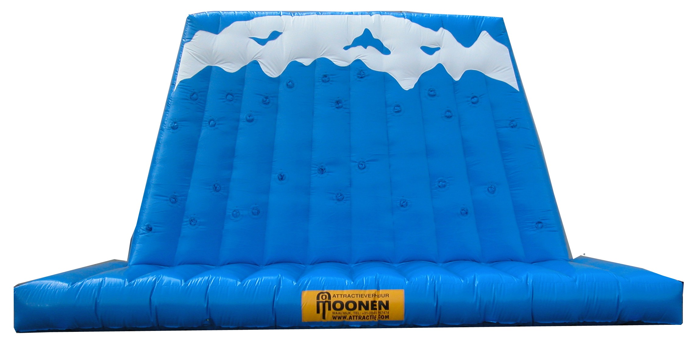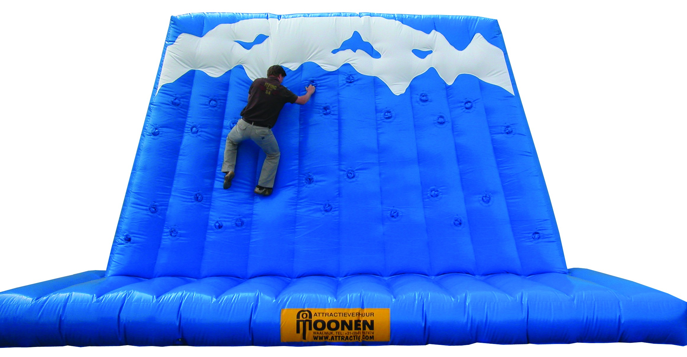 Deze klimmuur winter maakt het mogelijk om zonder klimzekering te klimmen. Vanwege de hoogte van 4,5 meter en het brede valkussen kan er vrijuit geklommen worden. Perfect om op een veilige manier een goede, leuke en unieke klimervaring te krijgen. Het speelse winter design maakt de attractie aangenaam voor elk winterevenement. Deze klimmuur ’winter’ is 7.5m bij 3m. De hoogte bedraagt 4,5 meter. Huur deze spectaculaire klimmuur met winter design en maak uw evenement compleet.