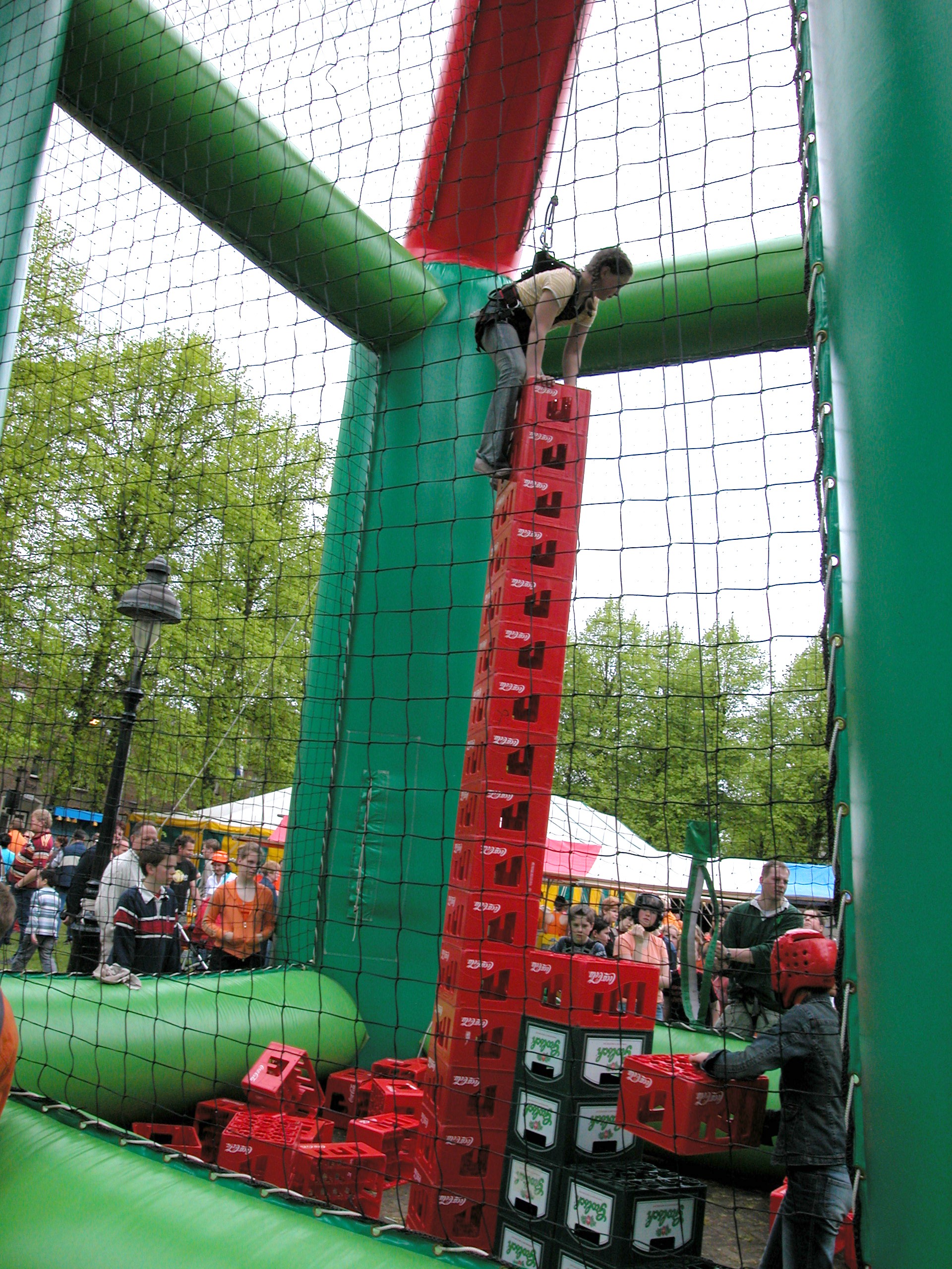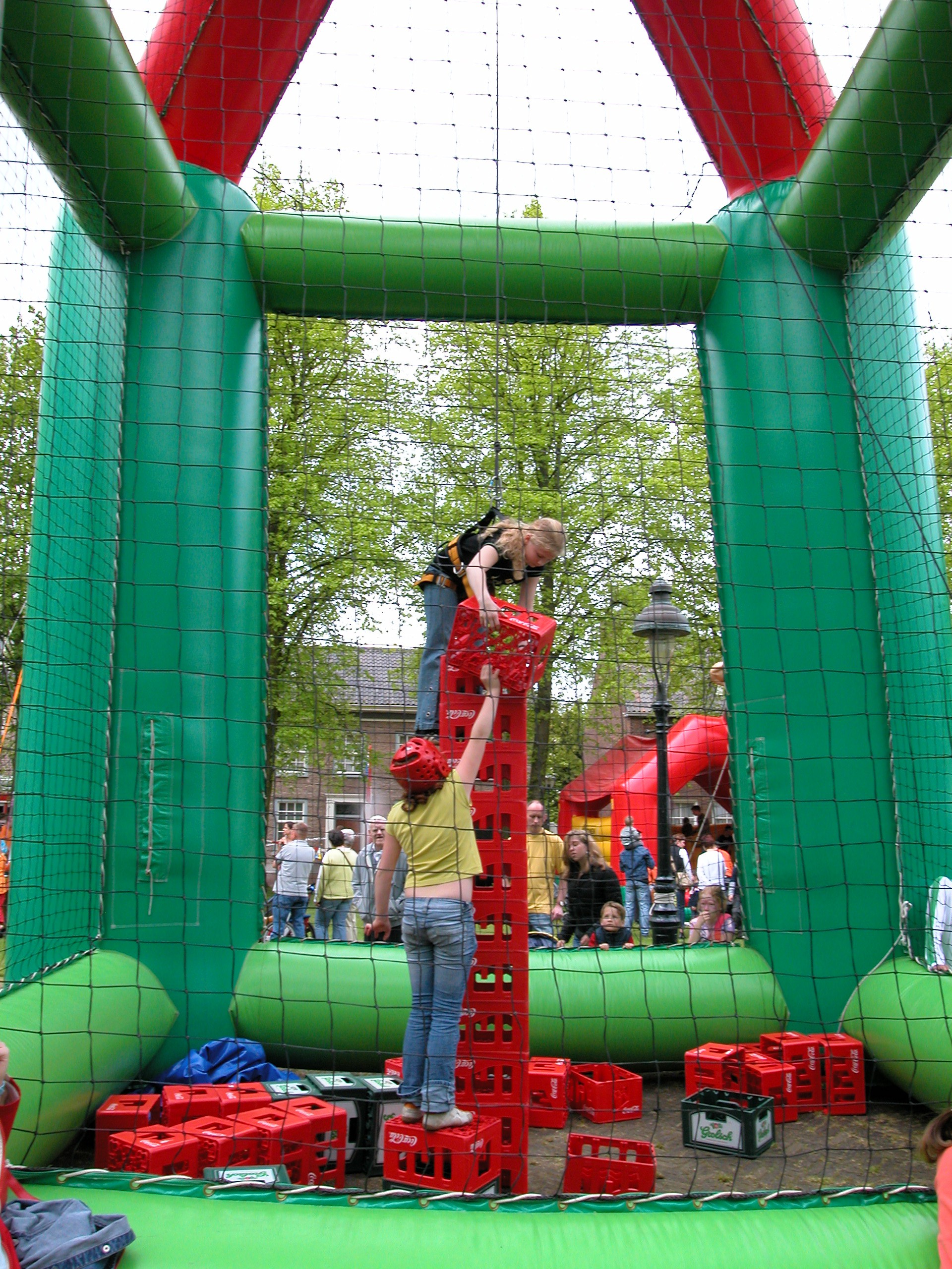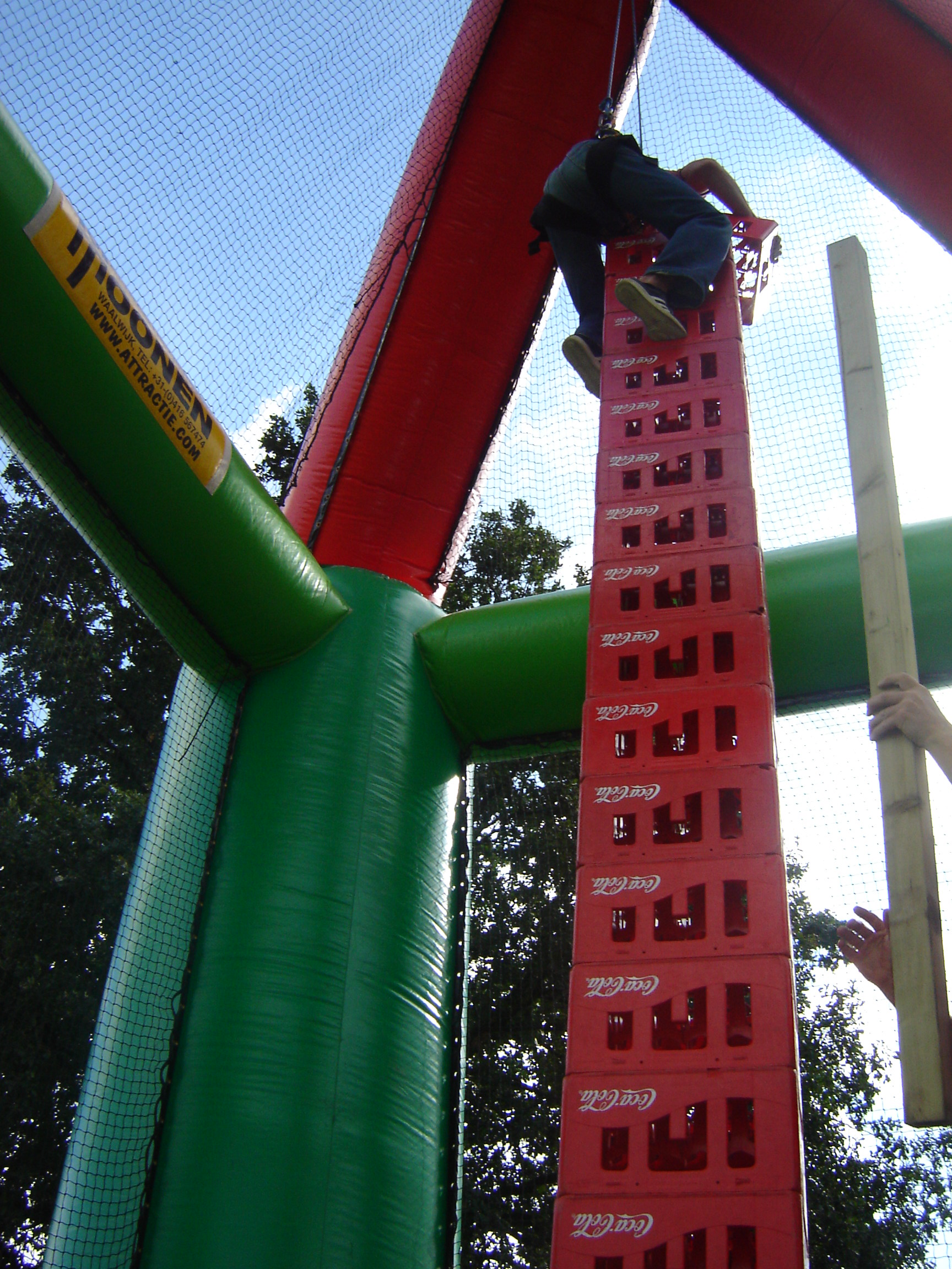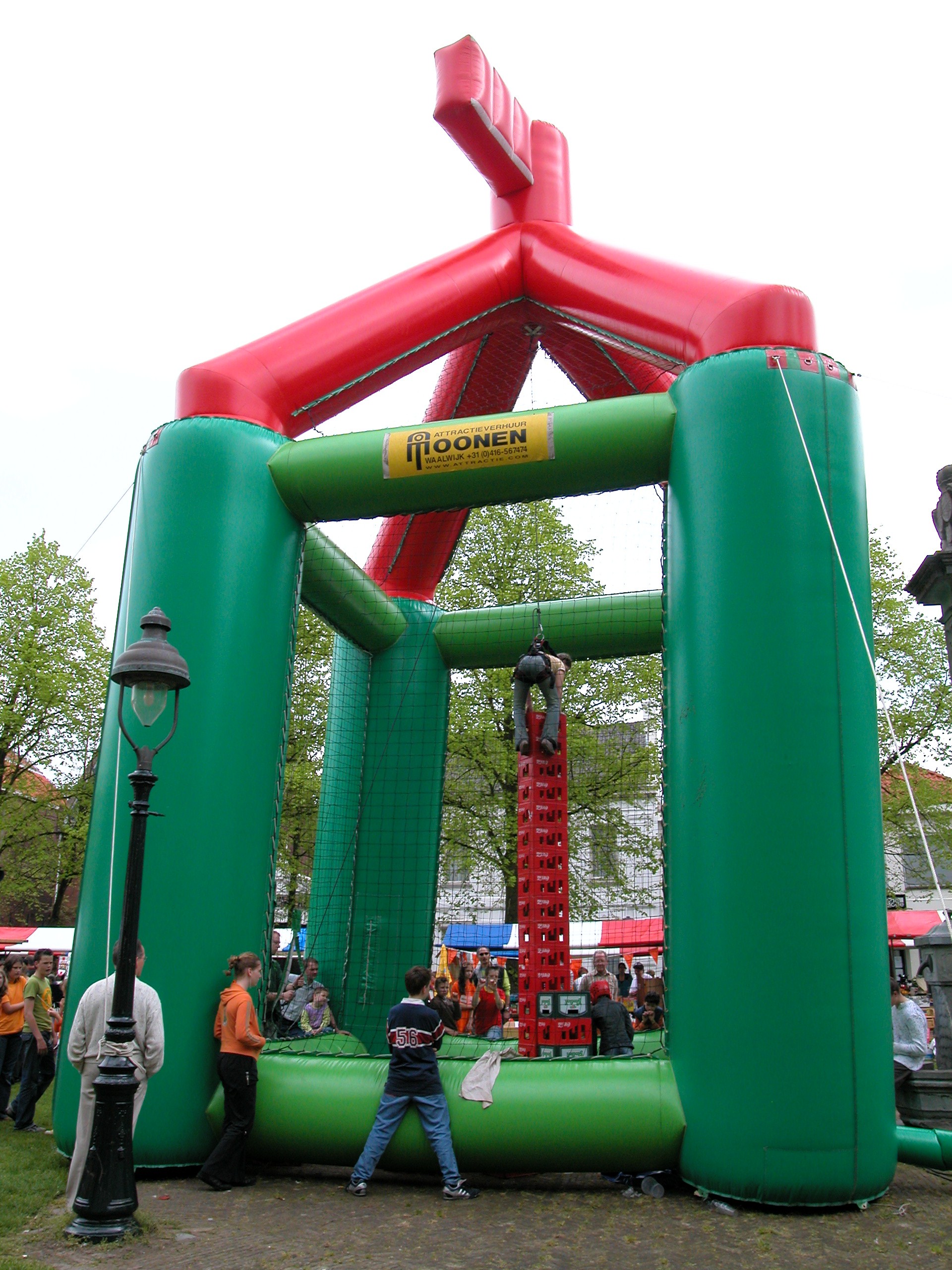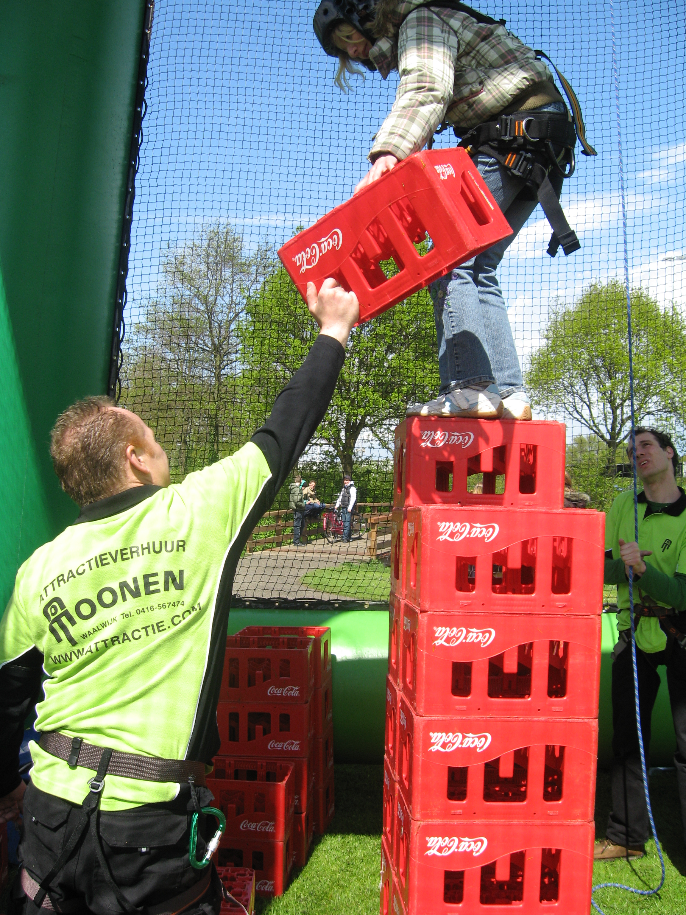 Zou je ook wel eens willen kijken hoe veel kratjes jij op elkaar kan stapelen zonder te vallen? Dan is kratje stapelen van Attractieverhuur Moonen een perfecte keuze voor jouw evenement. De deelnemer doet een tuigje aan die wordt vast gezekerd door de begeleider. Vanuit daar kunnen de kratjes op elkaar gestapeld gaan worden. Na elk kratje wordt de stapel steeds instabieler dus wordt het steeds uitdagender om de stapel hoger en hoger te maken. Vroeg of laat zal de stapel omvallen, maar geen paniek! De deelnemer is namelijk goed gezekerd en zakt hierdoor zeer rustig naar beneden tot hij of zij de grond raakt. Door de hoogte en grootte van deze attractie valt hij goed op en levert hij veel bekijks op. Door de netten rondom de attractie is het ook veilig voor de omstanders en blijven de kratjes netjes binnen de bepaalde ruimte. Dus wil jij een toffe, uitdagen attractie op uw evenement hebben staan? Huur dan "kratjes stapelen" voor de ultieme beleving.