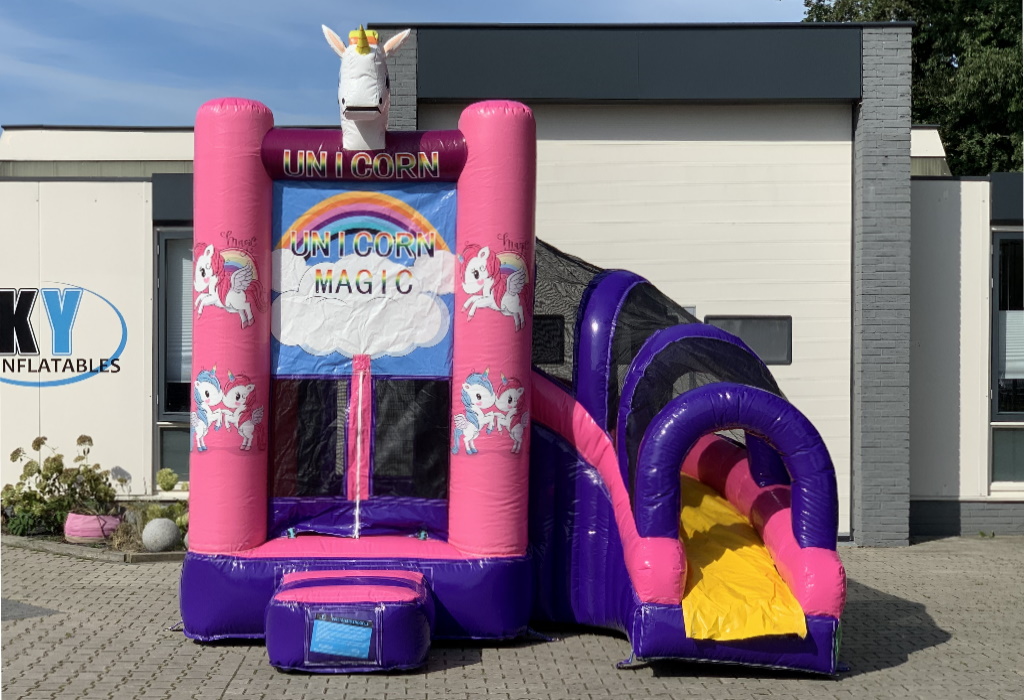 Klim, glij, klauter en klim met de unicorn multifun! Ga naar binnen, klim vervolgens omhoog en glij langs de glijbaan weer naar beneden! Door de diversiteit van een multiplay springkussen zullen de kinderen niet snel verveeld raken. Dit kussen past perfect op een evenement met bijvoorbeeld een unicornthema. Ook voor verjaardagsfeestjes is het hartstikke leuk. Dit kussen is echt voor de allerkleinste. Van 1 tot max. 5 jaar.