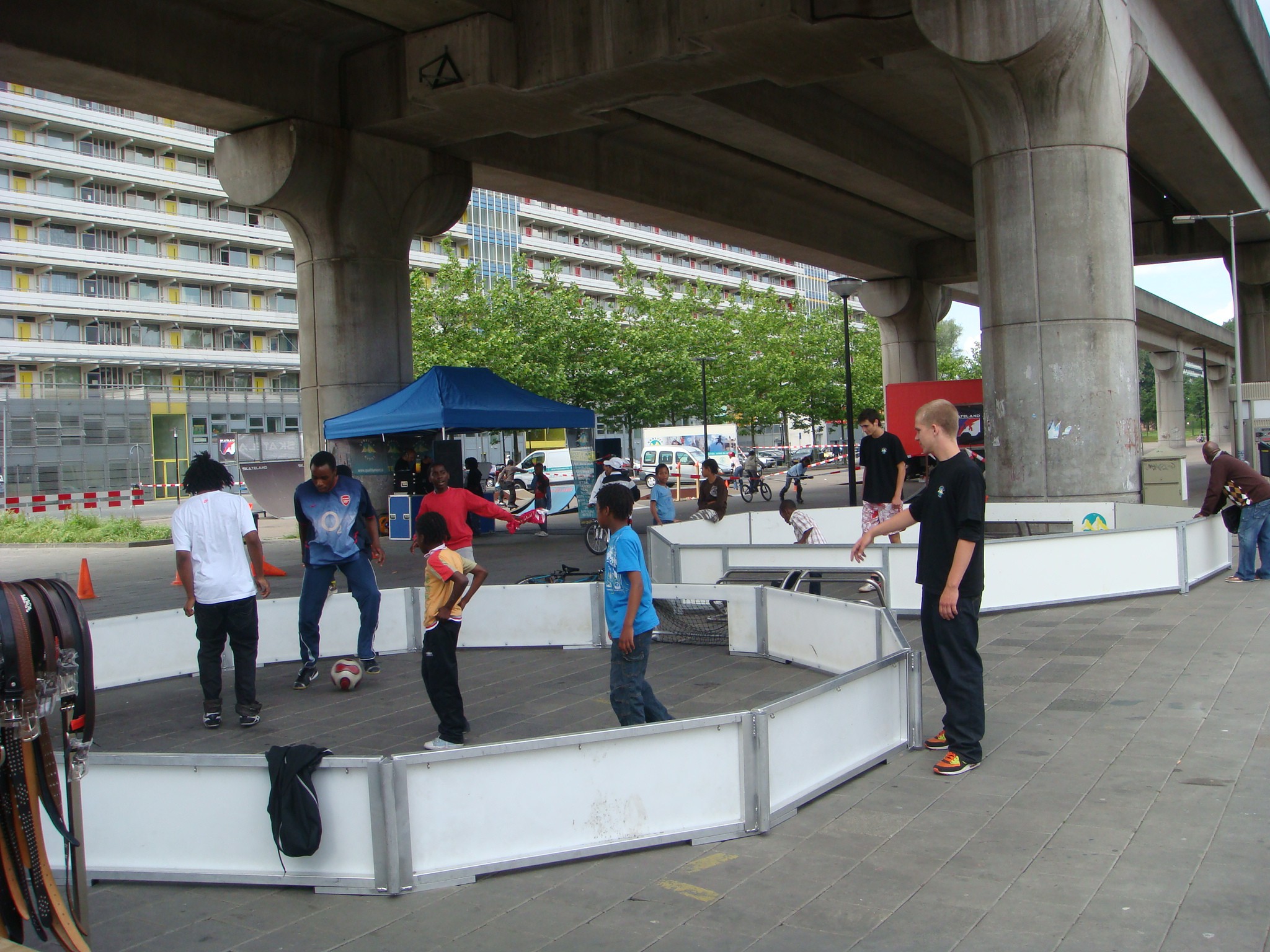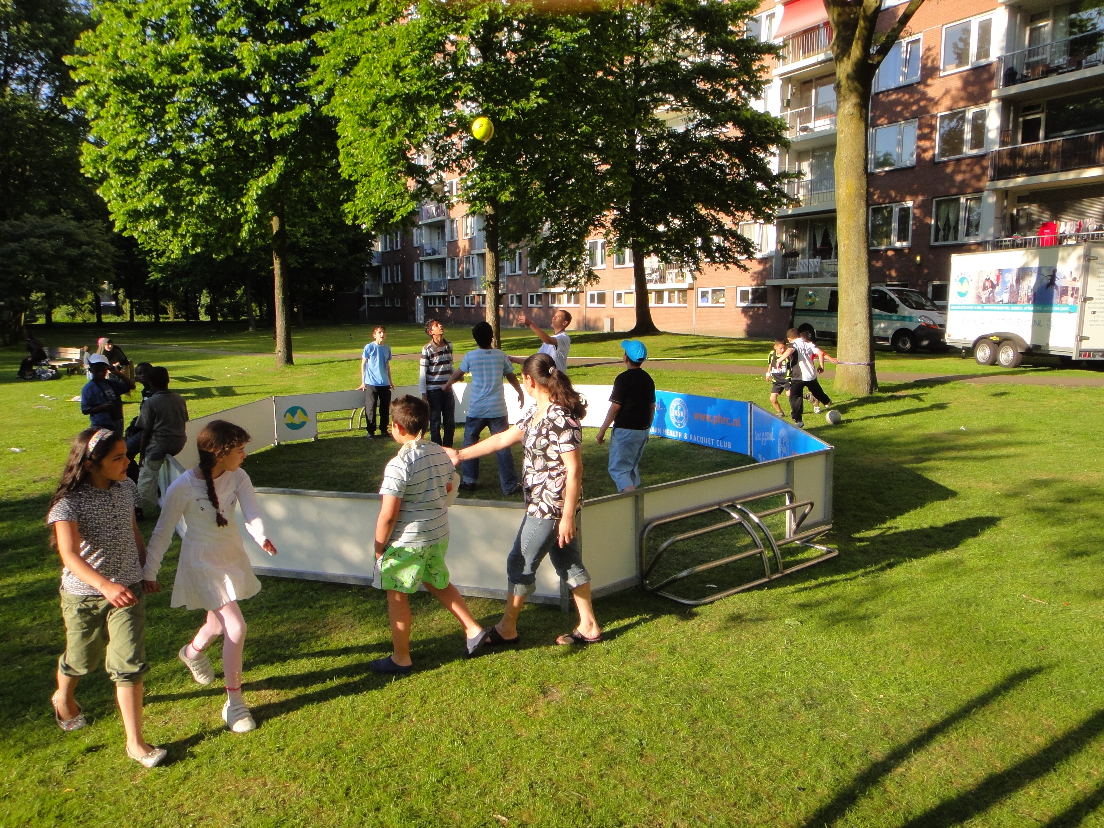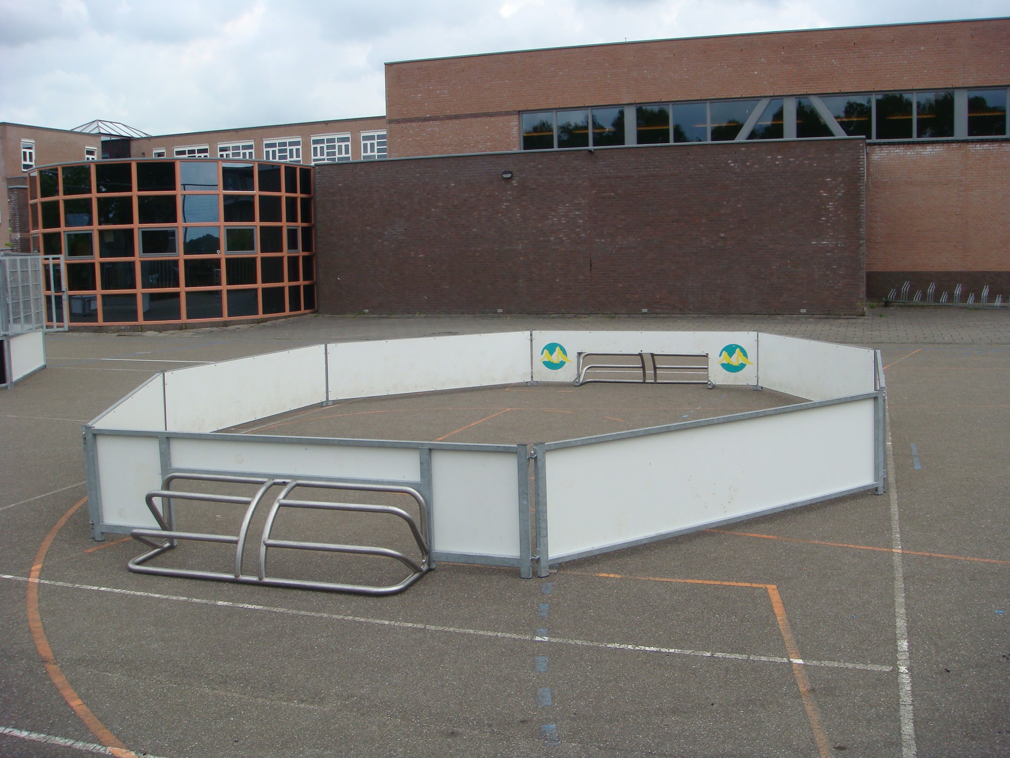 Kooi geschikt voor straatvoetbal. 8 panelen zijn 70 cm bij 265 cm en 4 kleinere panelen van 50 x 66 cm Afmeting is ong. 5 x 7 m. je kunt deze ook 5,3 x 6,3 m. maken. op + afbouw : 1 + 1 = 2 uur