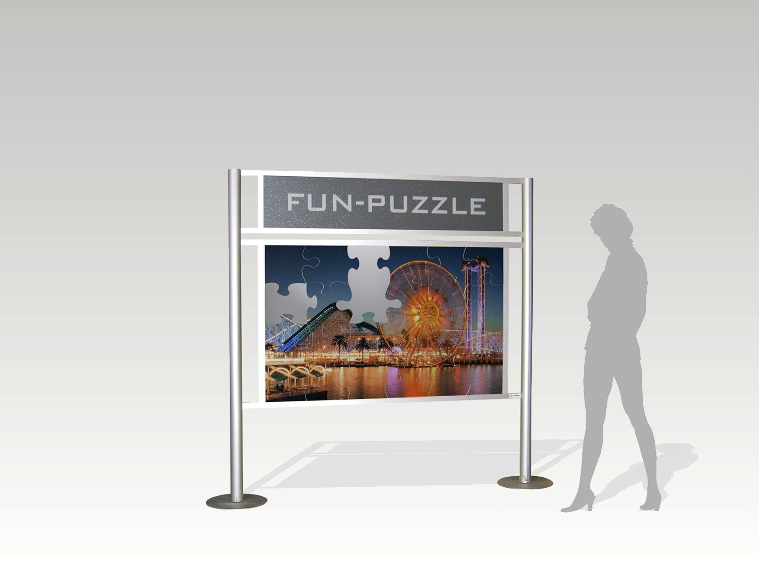 Zenuwslopende puzzelgame met mega puzzelstukken.Kan tegen een bepaalde tijd gespeeld worden of tegen elkaar d.m.v 2 sets. Kan fullcolor bedrukt worden voor acties en beurzen