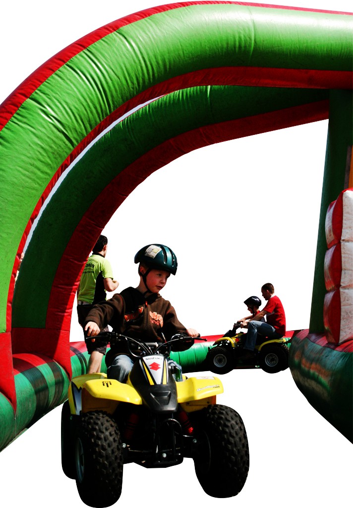 Een spectaculaire opblaasbare quadbaan, welke wordt geleverd met 3 extra quads. Met een lengte van 17 meter is er genoeg ruimte voor het vermaak om een rustig rondje te rijden.