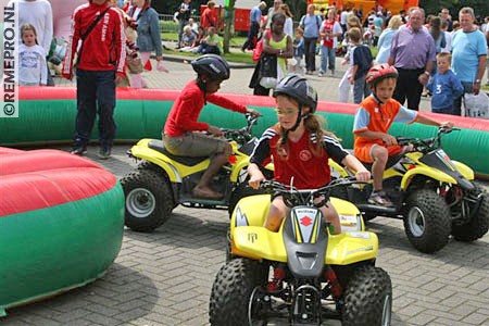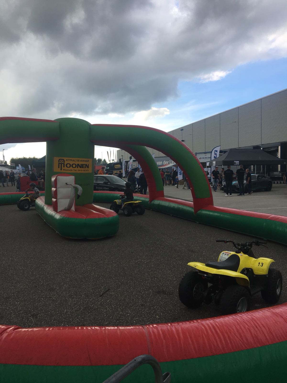 Een groot voordeel van de opblaasbare en flexibele boarding is dat je ten alle tijden zacht terecht zal komen. De baan is in opgeblazen conditie 17 m lang en 8 m breed. Let op! Er geldt hier wel een transport uitzondering. Deze attractie kan namelijk alleen gehuurd worden op verzorgingsbasis. Huur deze quadbaan, inclusief 3 quads, en maak met deze adrenalinebooster voor kinderen uw evenement compleet.