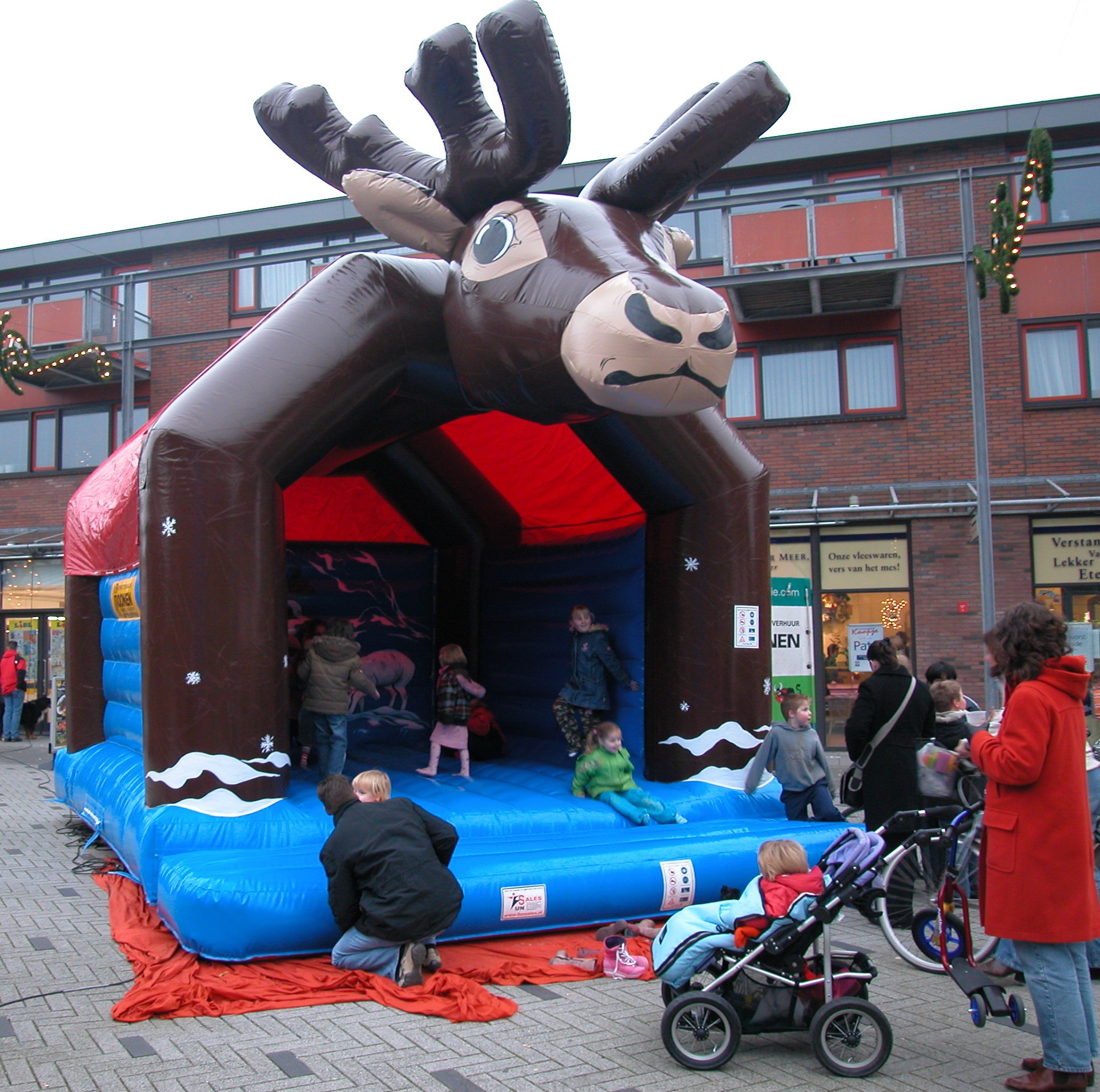 Heeft u een winters evenement waarbij een springkussen niet mag ontbreken? Dan is dit een super keuze voor jouw evenement. Dit rendier met vaste overkapping is namelijk een springkussen waarmee je meteen een winterse sfeer creëert. Ook heeft dit kussen een zeer grote afmeting. Hierdoor kunt u veel personen tegelijk laten springen waardoor iedereen snel aan de beurt kan komen. Hierdoor is dit springkussen ook geschikt voor de grotere evenementen met veel publiek. Door de rode overkapping over het springgedeelte hoef je niet bang te zijn voor wat regen. De spelende personen kunnen dan lekker blijven doorspringen. Dus heb je binnenkort een winters evenement waarbij een springkussen een must is? Huur dan snel de rendier met vaste overkapping voor gegarandeerd speelplezier.