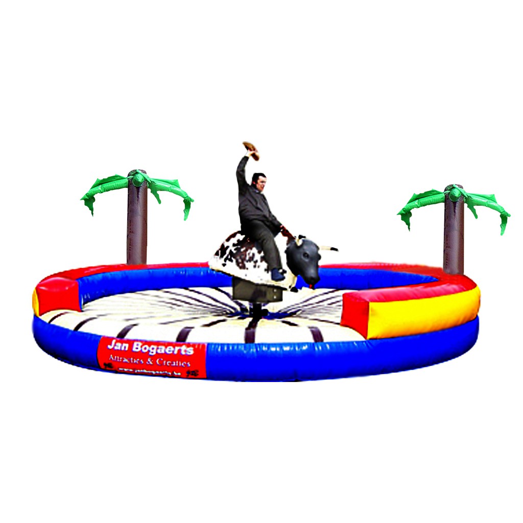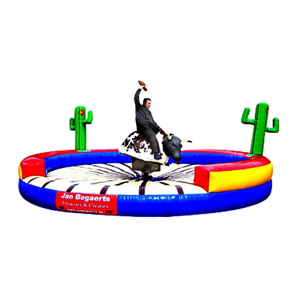 Deze rodeo is speciaal voor alle potentiële cowboys en alle andere personen die wel zin hebben in een adrenalinekick. Met deze prachtige rodeostier trek je zeker de aandacht, maar hoe lang houd jij het daadwerkelijk vol? De stier is te bedienen via onze bijgeleverde bedieningsunit. Met deze controlekast kan de stier door de bediener in verschillende snelheden worden laten rondgedraaid. Daarnaast is er ook de mogelijkheid tot bokken. De Bucking Bull is 100% gecontroleerd en gecertificeerd volgens de richtlijnen van de Europese Unie en daarom uiterst veilig. Om de stier voldoende kracht te geven om iedereen een spectaculaire rit/vlucht te kunnen garanderen is een vrije onbelaste spanningslijn van 230V/16A noodzakelijk. Deze lijn moet binnen 25 m van de stroombron staan en moet niet gekoppeld zijn aan andere apparatuur. Huur deze spectaculaire rodeo ‘’Bucking Bull’’, zet één cowboyhoed op en versla de stier. Succes gegarandeerd.