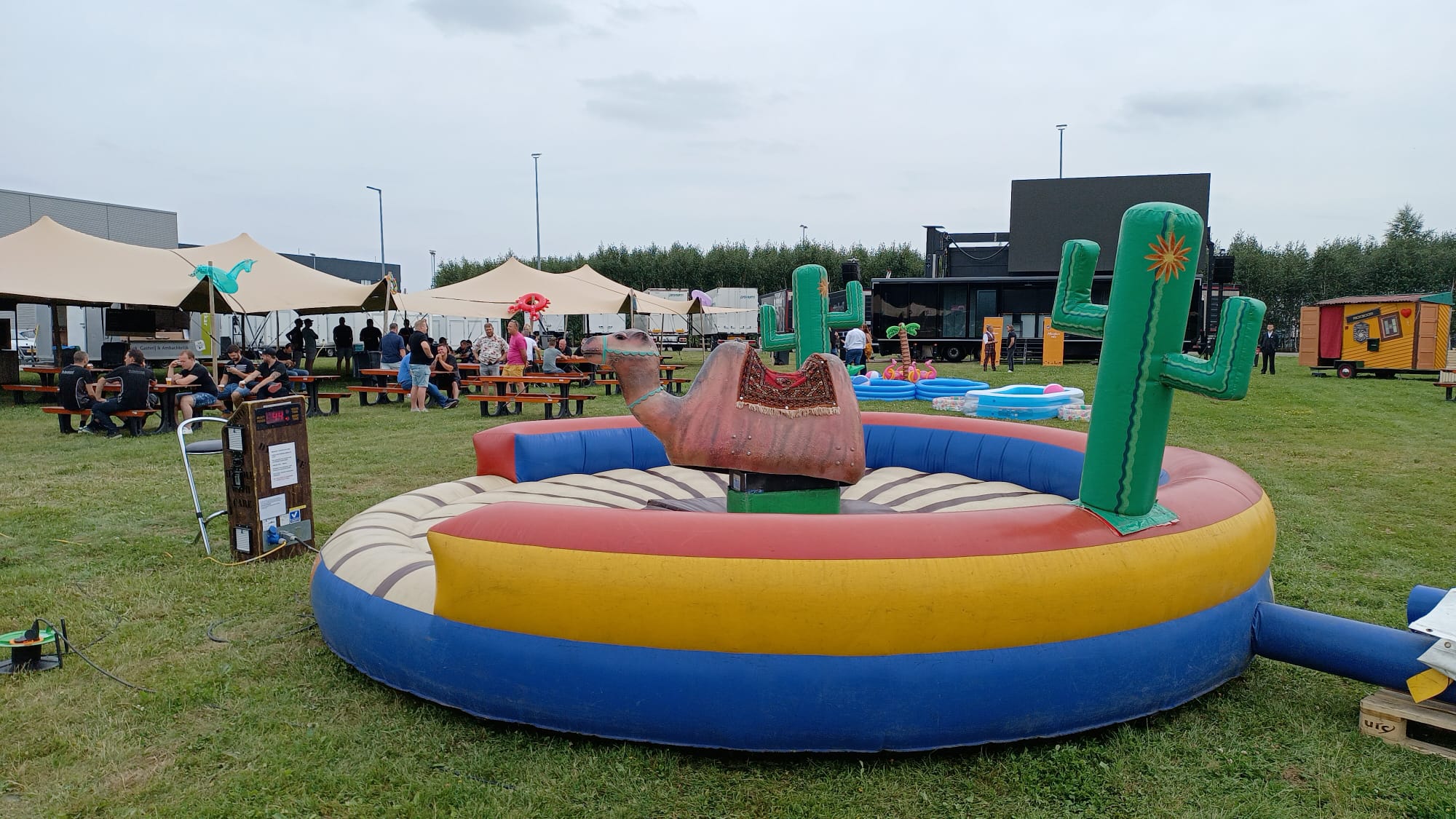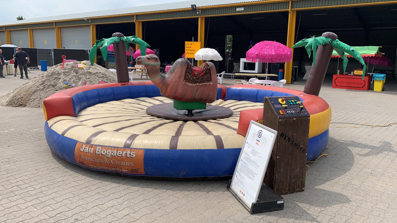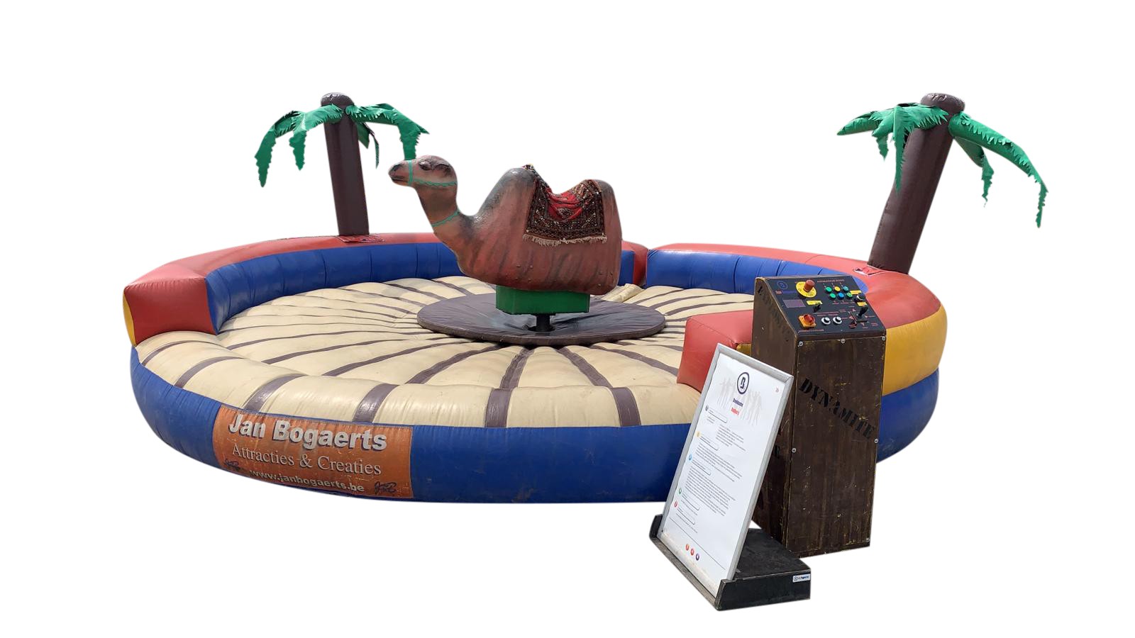 Ooit al op een kameel gezeten, laat staan een rodeo kameel? De Bucking Camel is de meest spectaculaire kameel op aarde. Deze rodeo kameel zal zijn uiterste best doen om jouw uithoudingsvermogen eens goed te testen en je op een unieke en sensationele ervaring te trakteren. Dit snelheidsmonster kan worden bediend door middel van een bedieningsunit. Op dit bedieningsapparaat zitten knoppen om de kameel in verschillende snelheden te laten ronddraaien. Daarnaast is er ook nog de mogelijkheid om de kameel te laten bokken. Verder is het systeem uitgerust met een chrono display om de beste tijd te kunnen bijhouden. Voor het gebruik en goed functioneren van deze kameel is geen water nodig, maar enkel één vrije onbelaste spanningslijn (230V/16A). Deze lijn moet binnen 25 meter van de stroombron staan en mag niet worden gebruikt door andere apparatuur. Pak de bulten van deze rodeo kameel maar eens goed vast en ervaar de kracht en adrenalinekick van deze ‘’Bucking Camel.’’