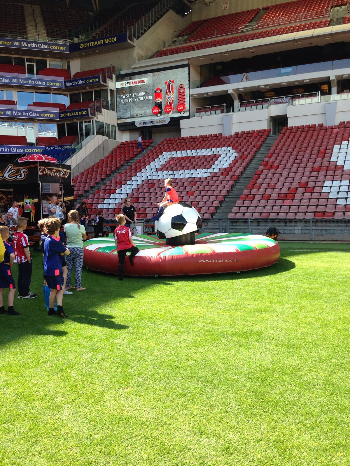 Heb je binnenkort een (sport) evenement waarbij een attractie nodig is die zorgt voor de nodige adrenaline? Dan is deze attractie een perfecte optie voor jou! Met de rodeo voetbal heb je gegarandeerd leuke foto en film momenten. De rodeo voetbal kan makkelijk bediend worden via het bijgeleverde bedienpaneel. De bedienpaneel is voorzien van snelheidsregelaars waardoor het een plezier is voor jong en oud. En als je de rodeo niet meer kan houden en er afvalt zal je nooit hard vallen. Dit doordat er rondom de rodeo een zacht valkussen ligt. Voor deze attractie is een onbelaste stroombron van 220 volt nodig binnen de 25 meter en er moet geen andere apparatuur aangekoppeld zijn. Dus wil jij laten zien dat je de bal in bedwang kan houden? Huur hem dan gemakkelijk en snel via de website of contact een van onze vriendelijke medewerkers.