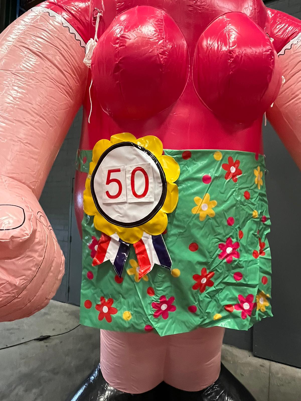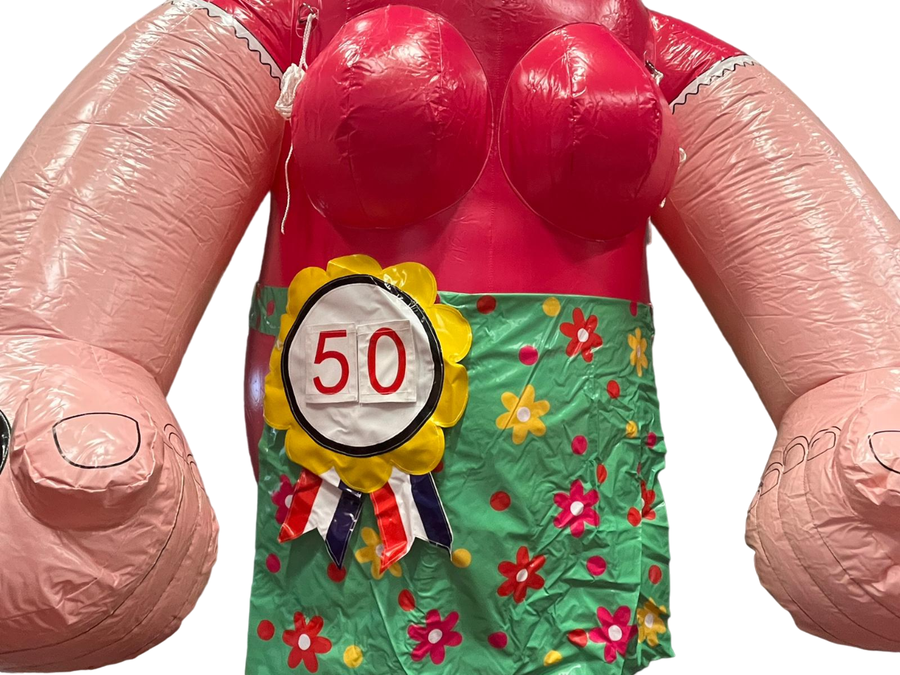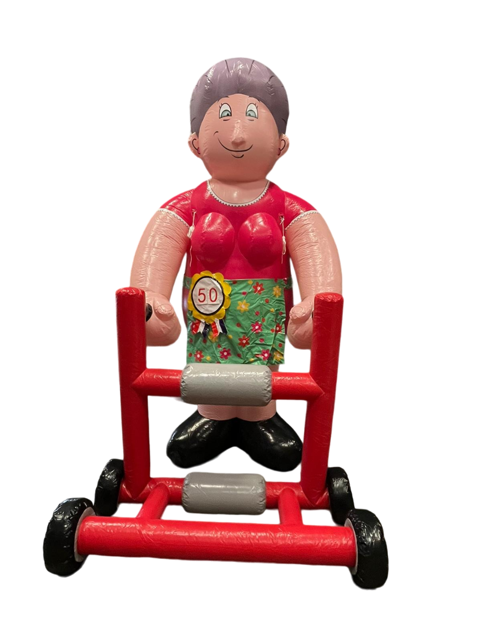 Deze Sarah met rollator is de ideale inflatable / opblaaspop mocht u iemand die 50 wordt, op een ludieke manier in het zonnetje willen zetten. De Sarah is zeer gemakkelijk op te zetten. Wij leveren deze inclusief blower en haringen.