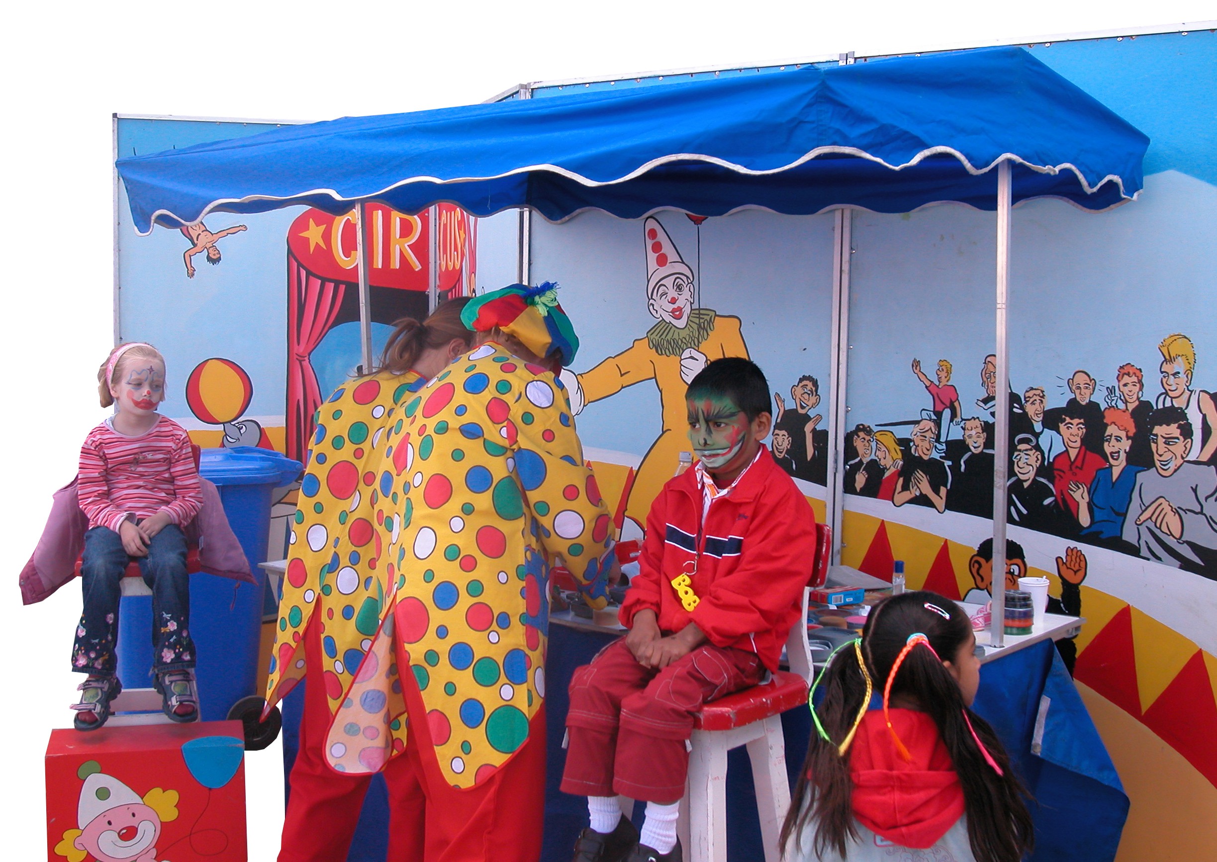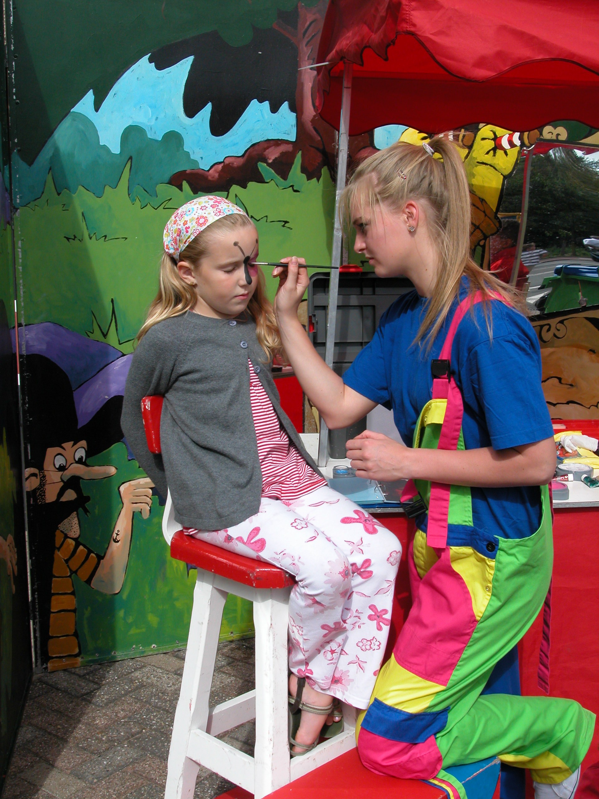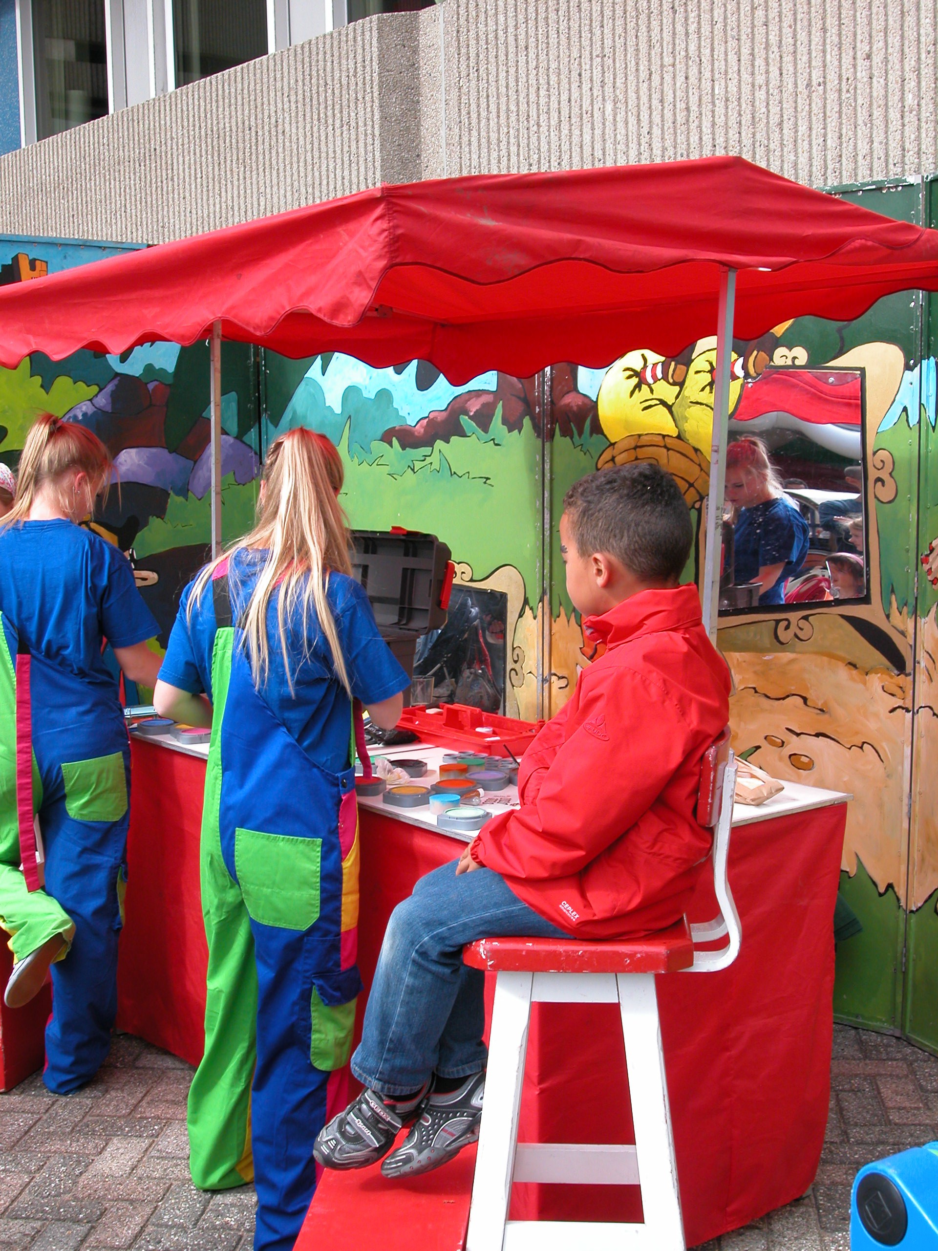 Een schminkstand verzorgd door twee personen. Zij zullen de kinderen betoverend schminken.
