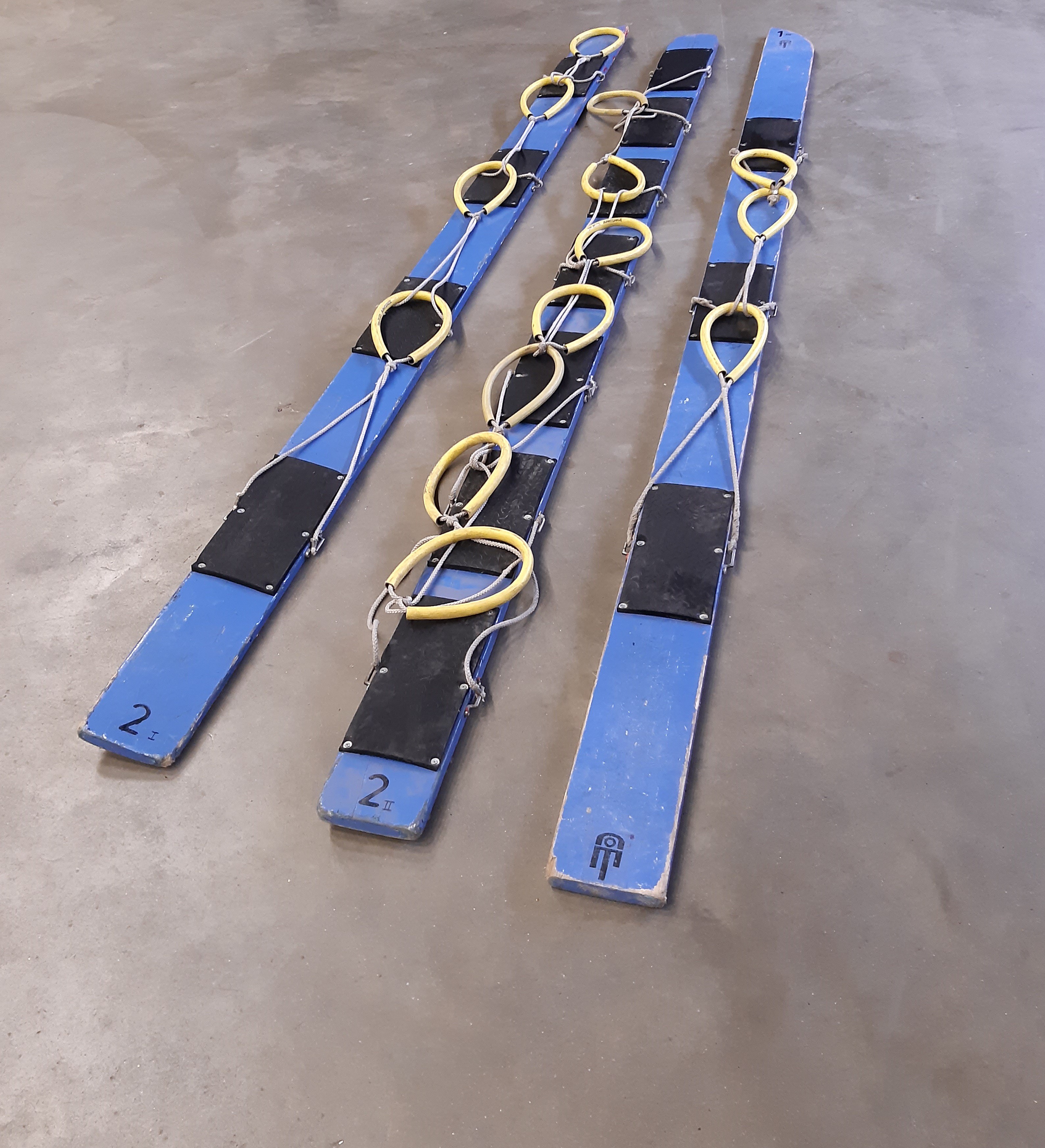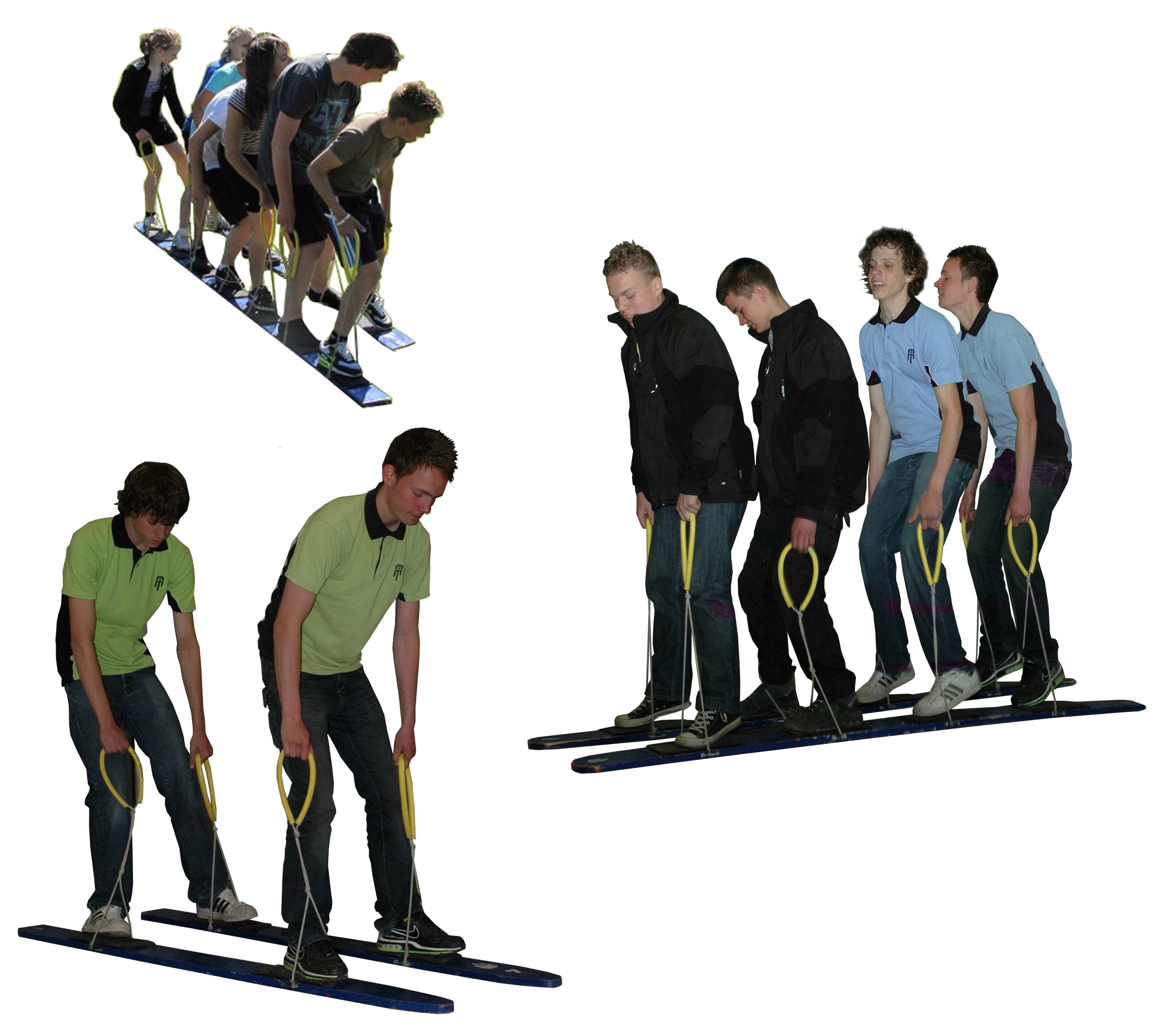 Met z'n 7-en tegelijk op ski's lopen, loop zo snel mogeljik zonder te vallen.