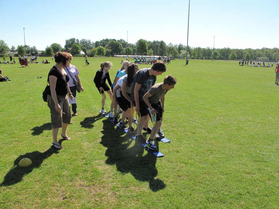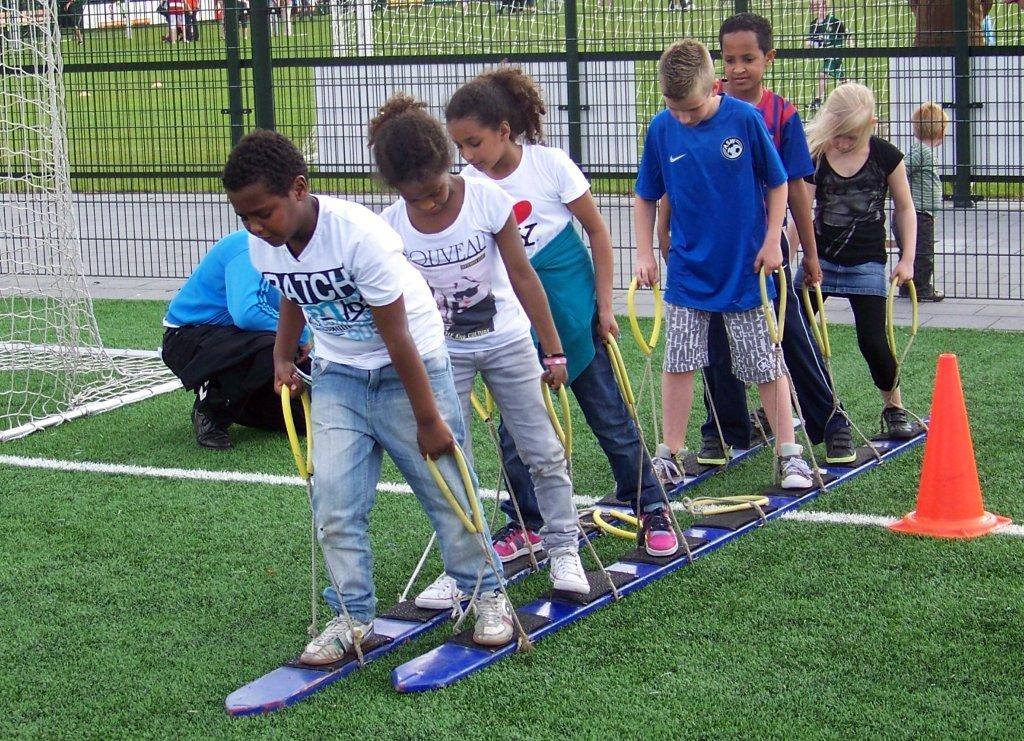 Met z'n 7-en tegelijk op ski's lopen, loop zo snel mogeljik zonder te vallen.