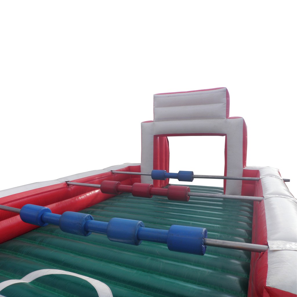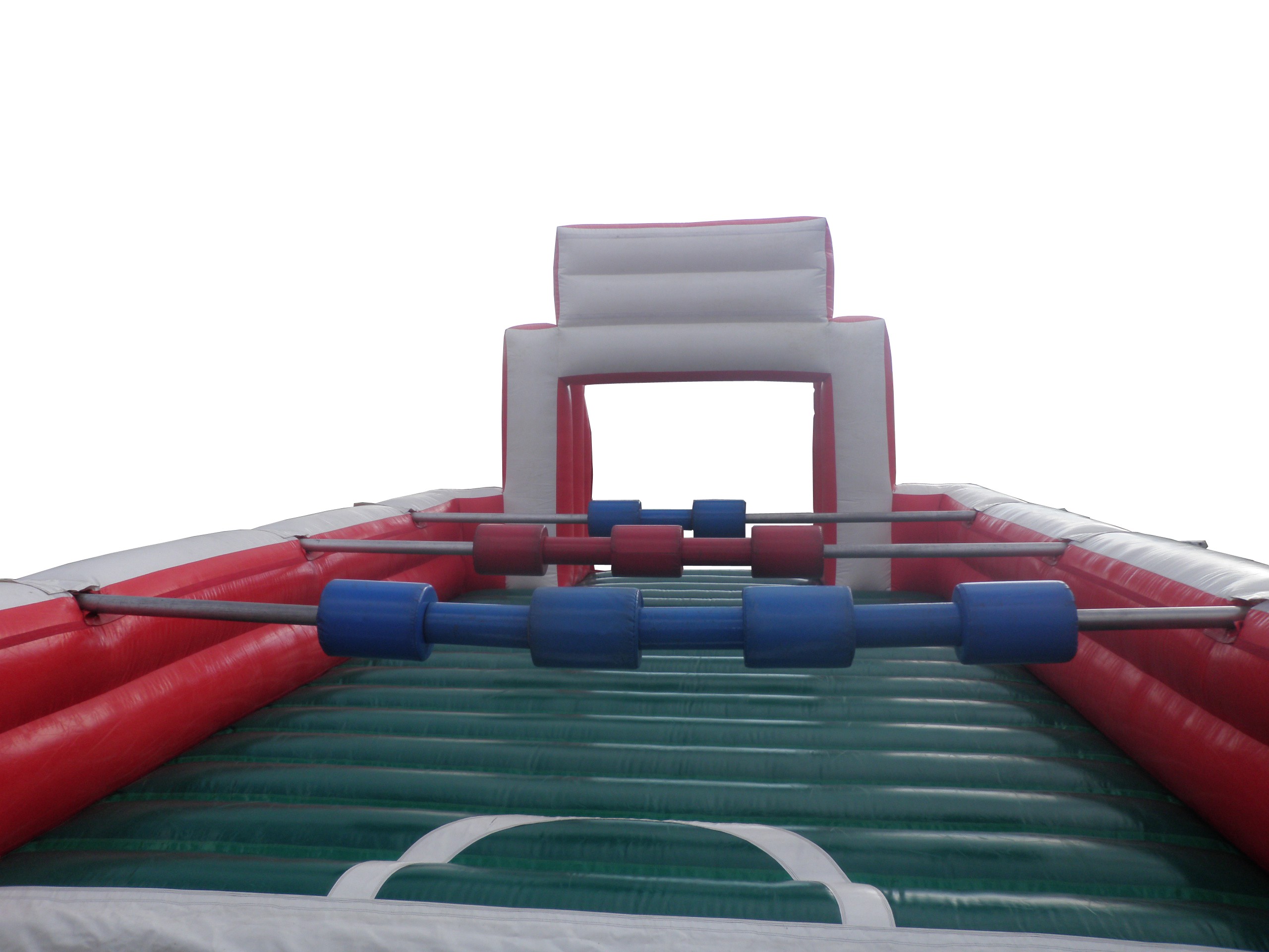 Levend tafelvoetbal. Twee teams strijden tegen elkaar op dit enorme levende tafelvoetbalspel.