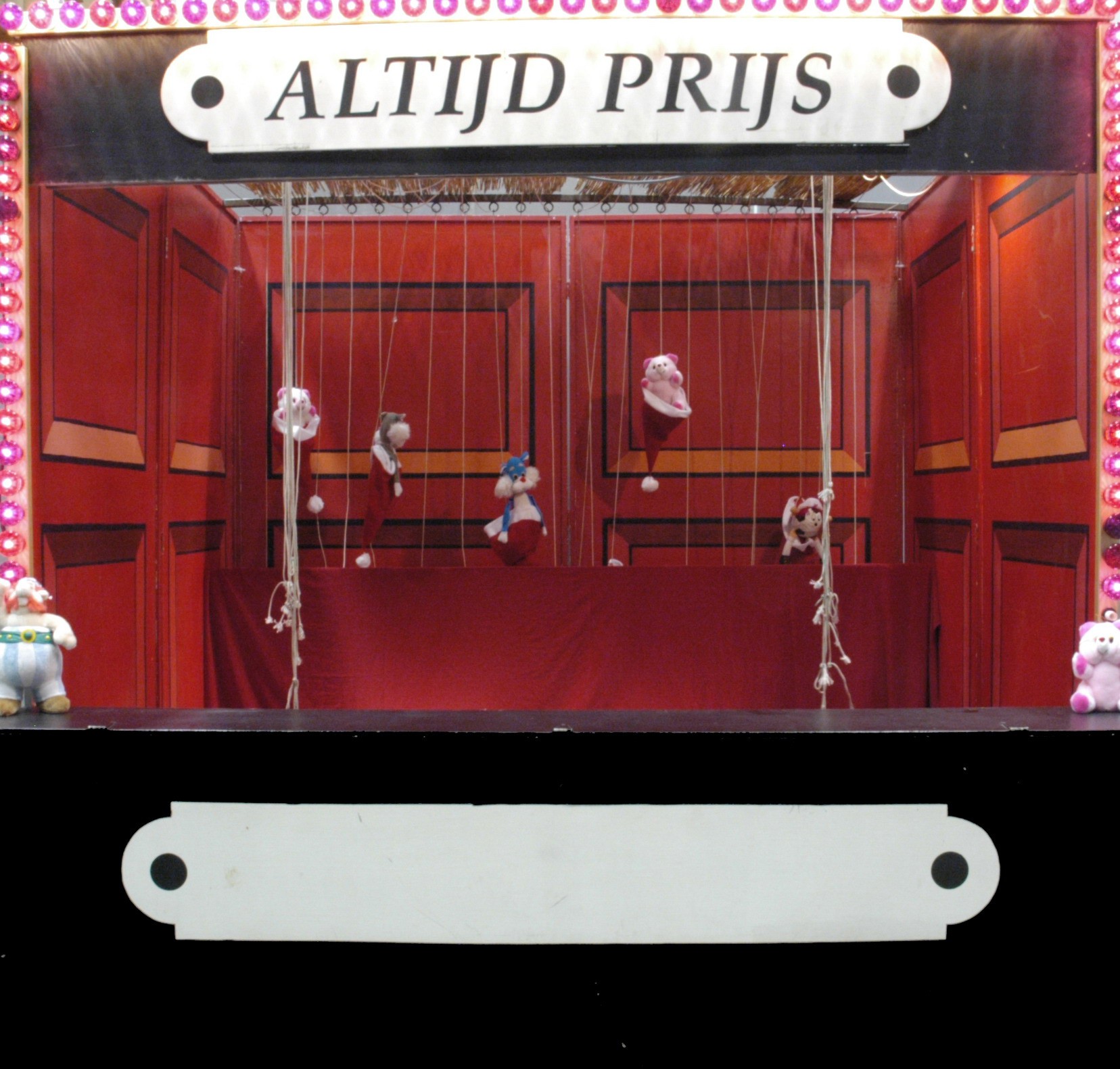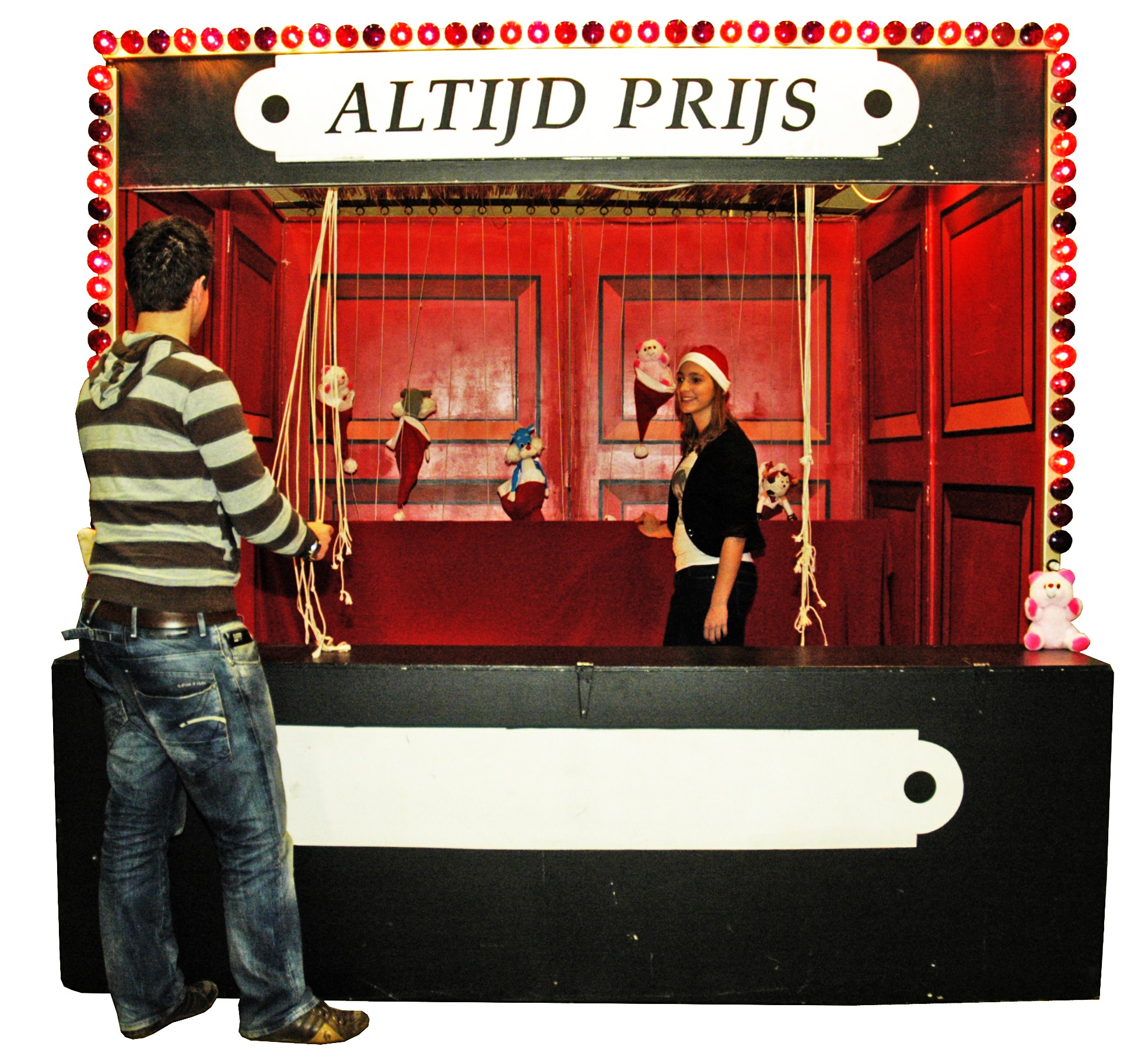 Touwtjetrekken, trek aan het juiste touw en het cadeautje komt in een kerstmuts omhoog. De stand is exclusief prijzen, dus hang er uw eigen prijsjes in!