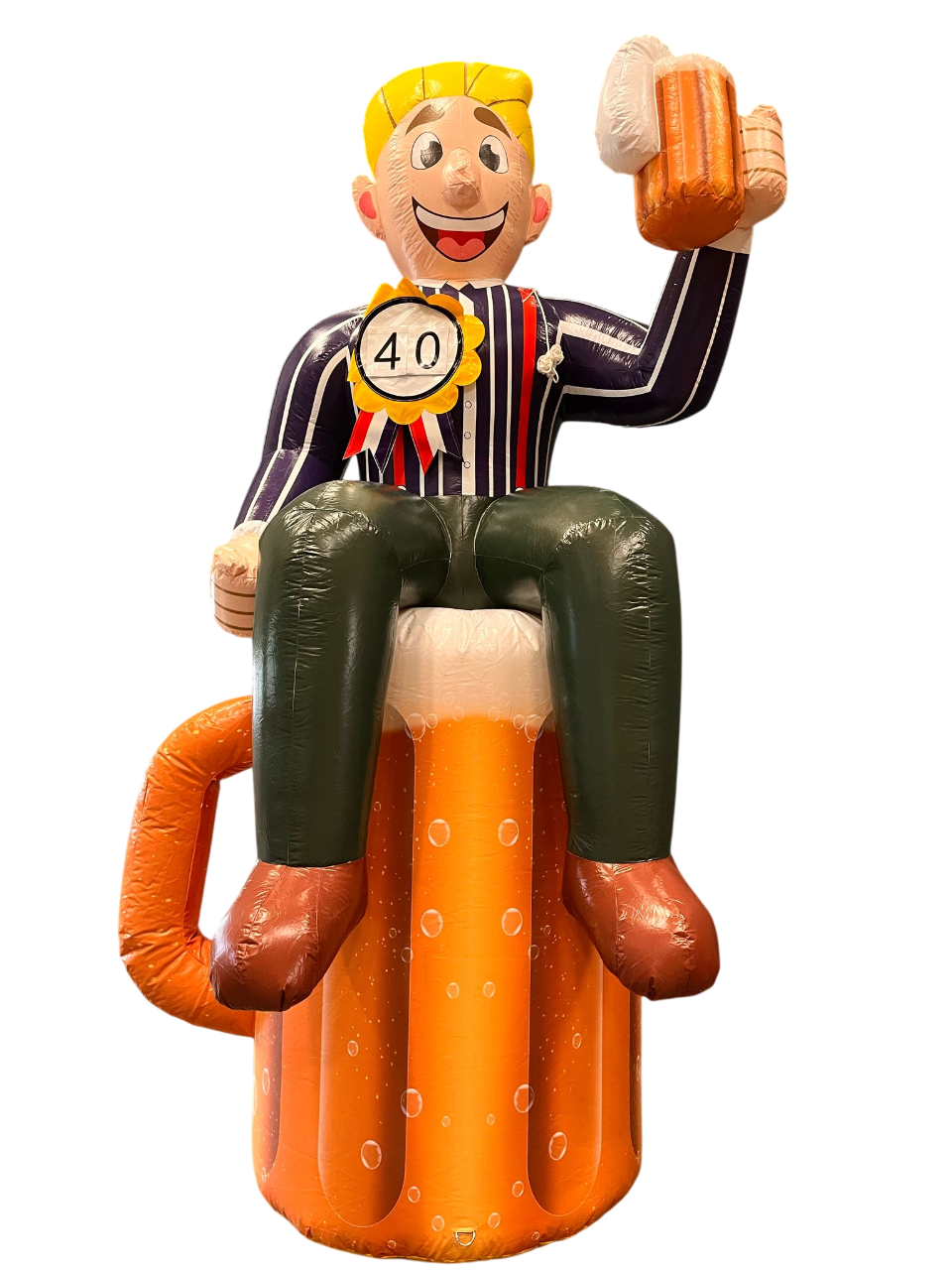 Wat is er leuker dan deze opblaasbare pop van een man op een bierglas om de jarige in het zonnetje te zetten?