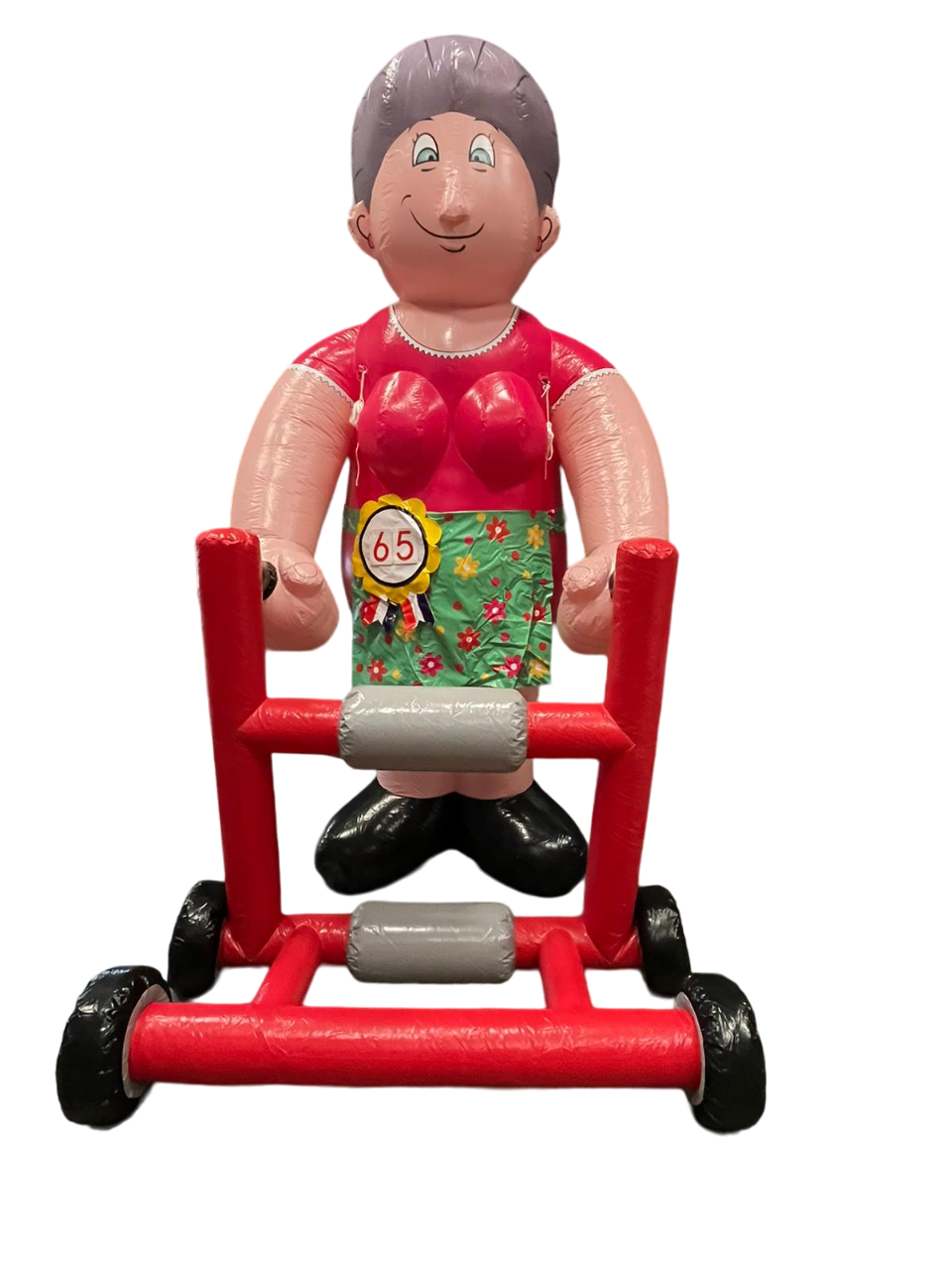 Deze verjaardagspop met rollator is de ideale inflatable mocht u iemand die 65 wordt, op een ludieke manier in het zonnetje willen zetten. De inflatable is zeer gemakkelijk op te zetten.