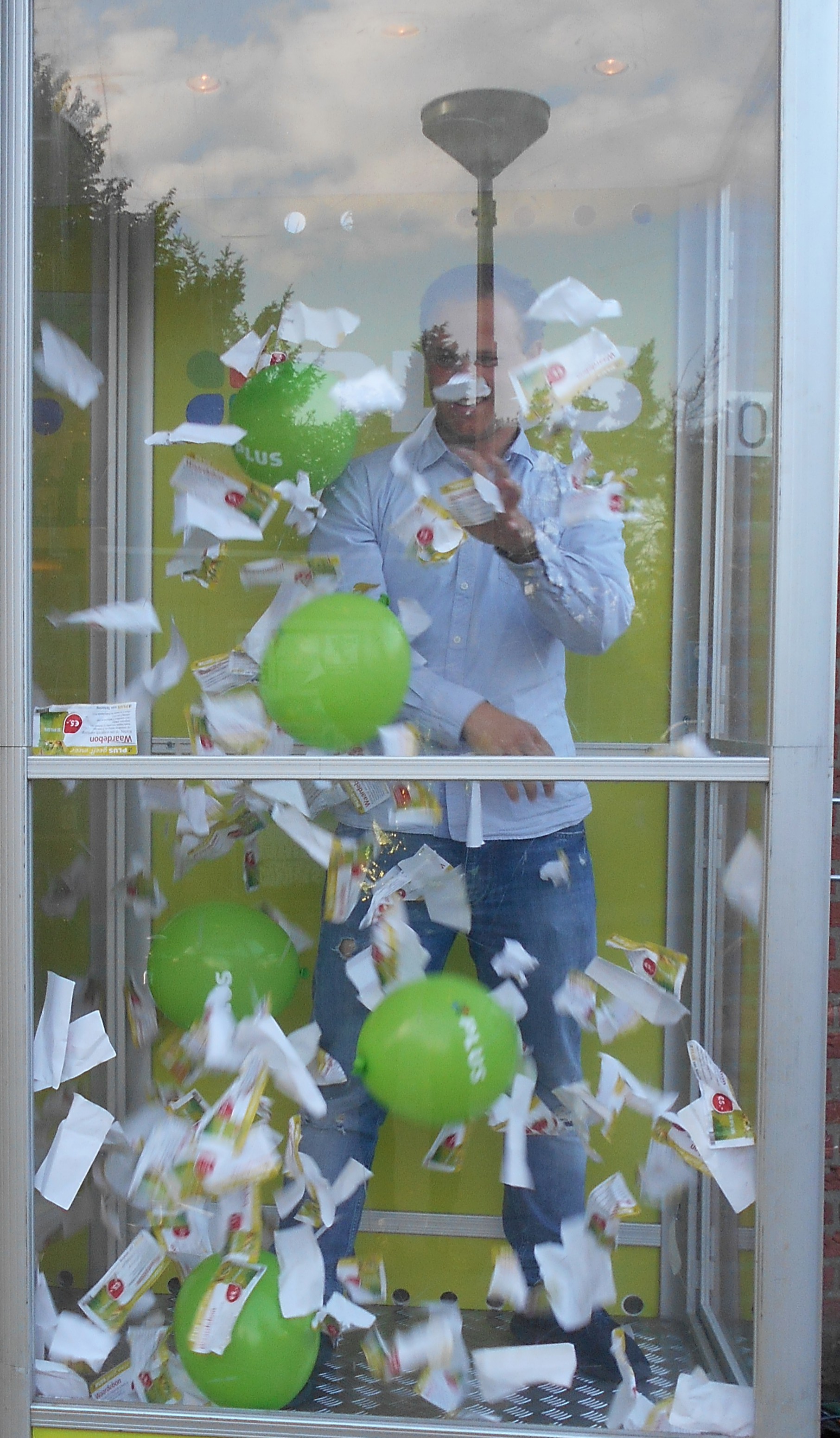 Ga in de wervelwind staan en probeer de vliegende biljetten te vangen. Wie vangt de meeste balletjes?