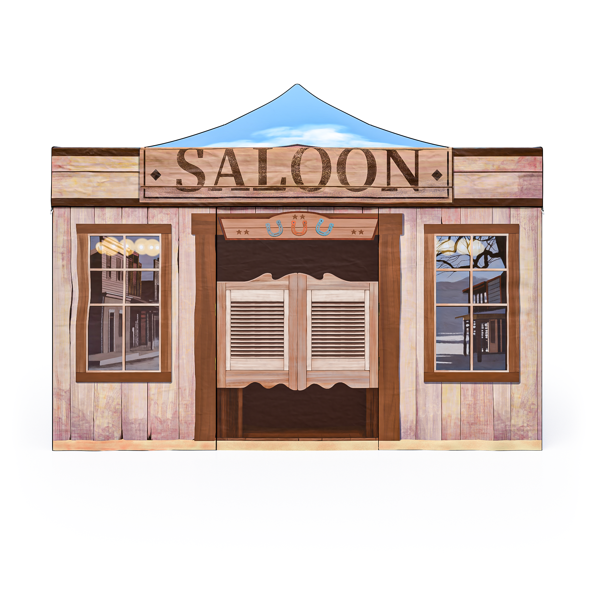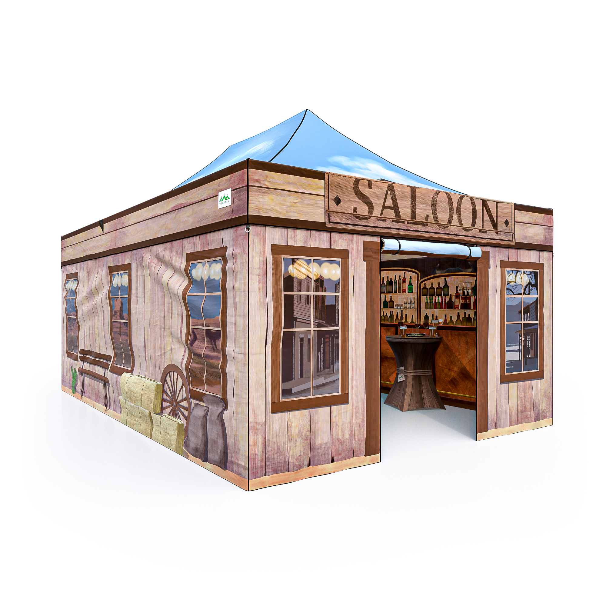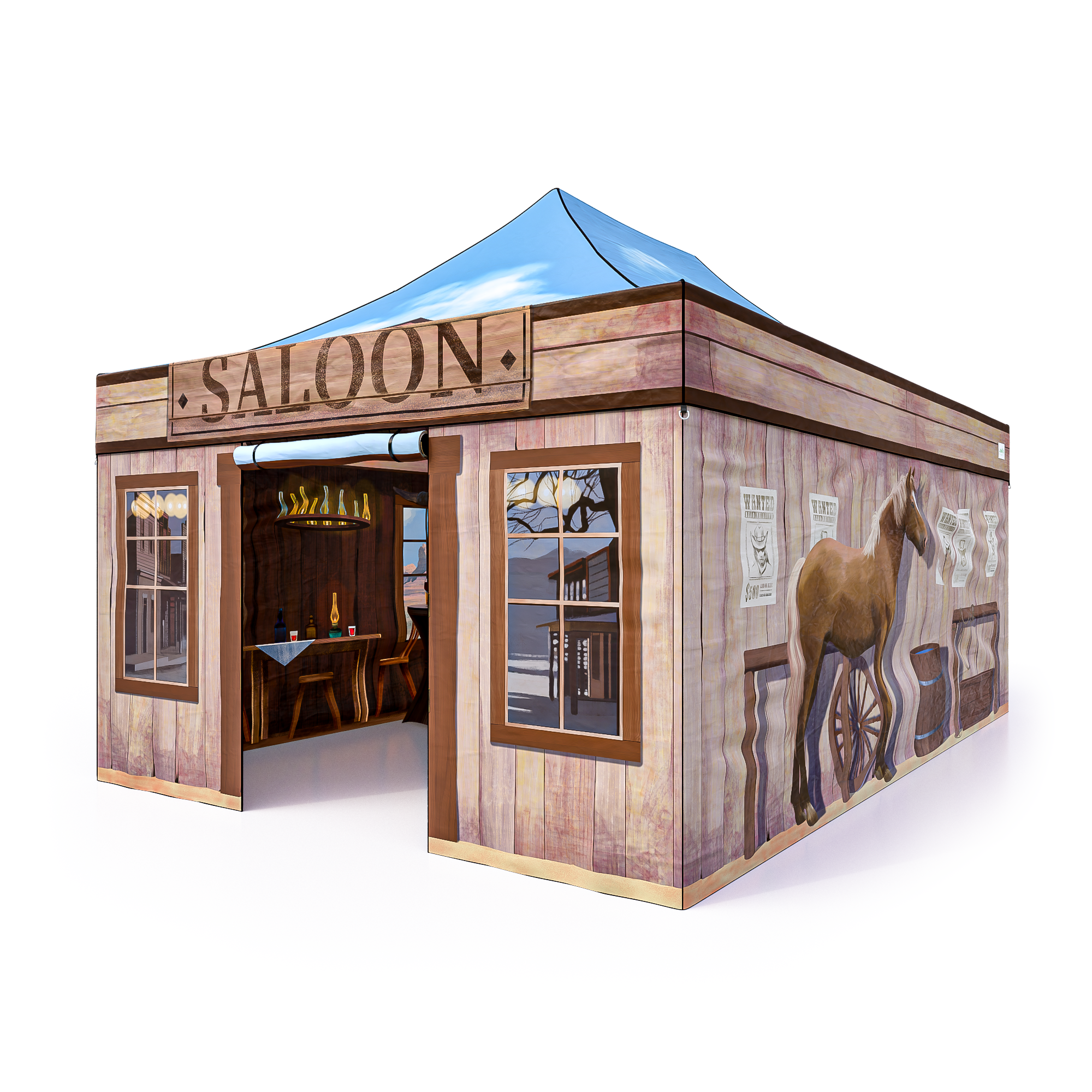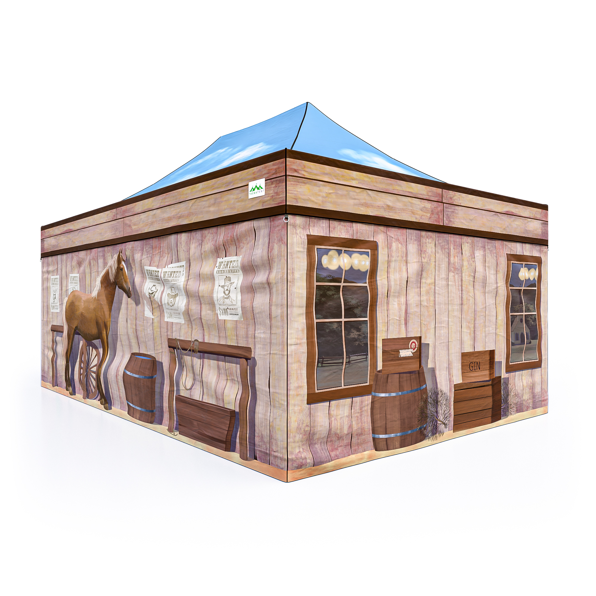 Betreed het Wilde Westen met onze Western Easy up tent en ervaar de unieke sfeer van het cowboytijdperk. Het authentieke Western design van de tent met details zoals houten panelen, touwen en cowboysymbolen brengt de magie van het Wilde Westen tot leven. Of je nu een themafeest, festival of kinderevenement organiseert, deze tent zorgt voor een onvergetelijke beleving waarbij jouw gasten zich even echte cowboys en cowgirls voelen.