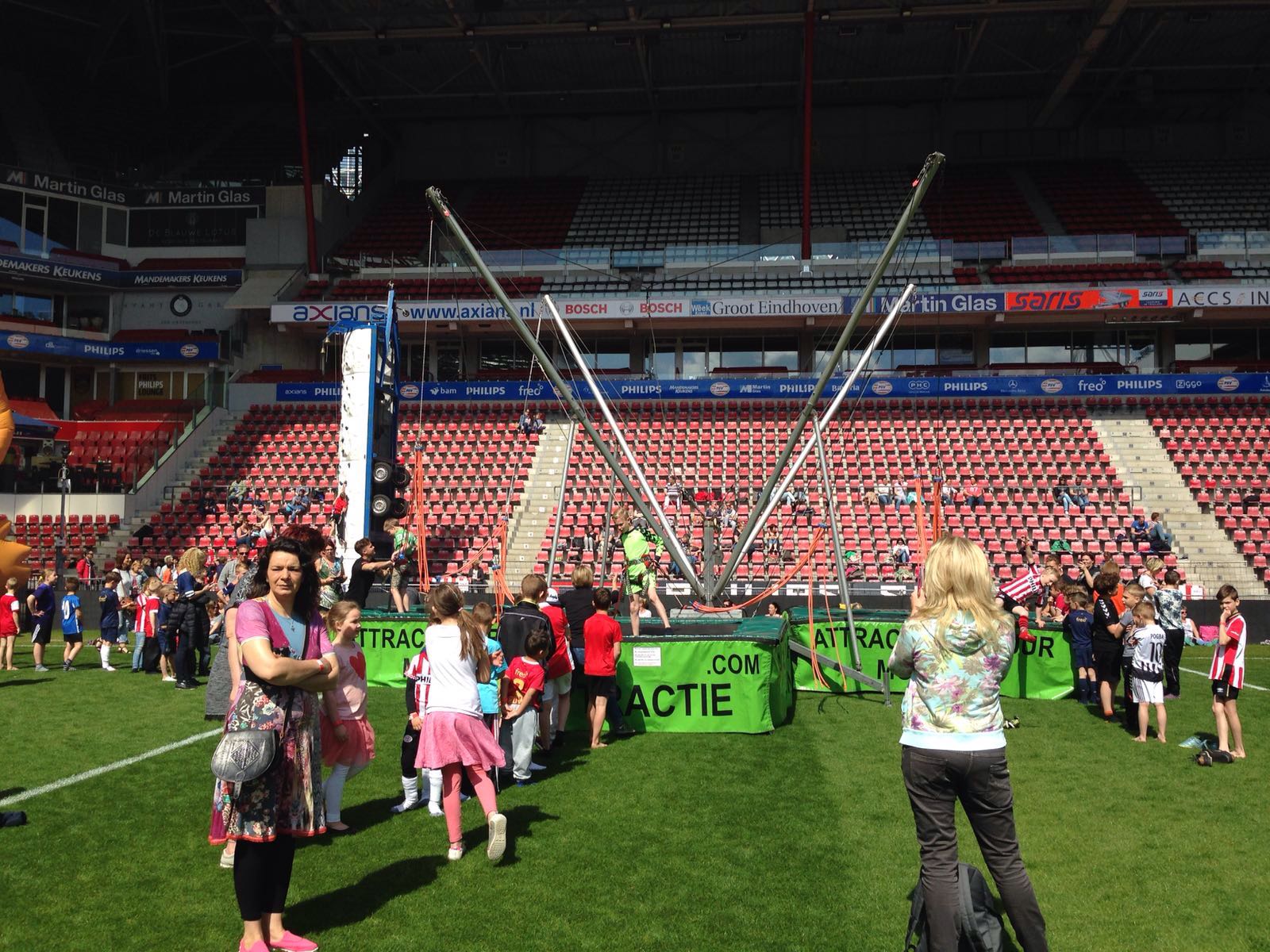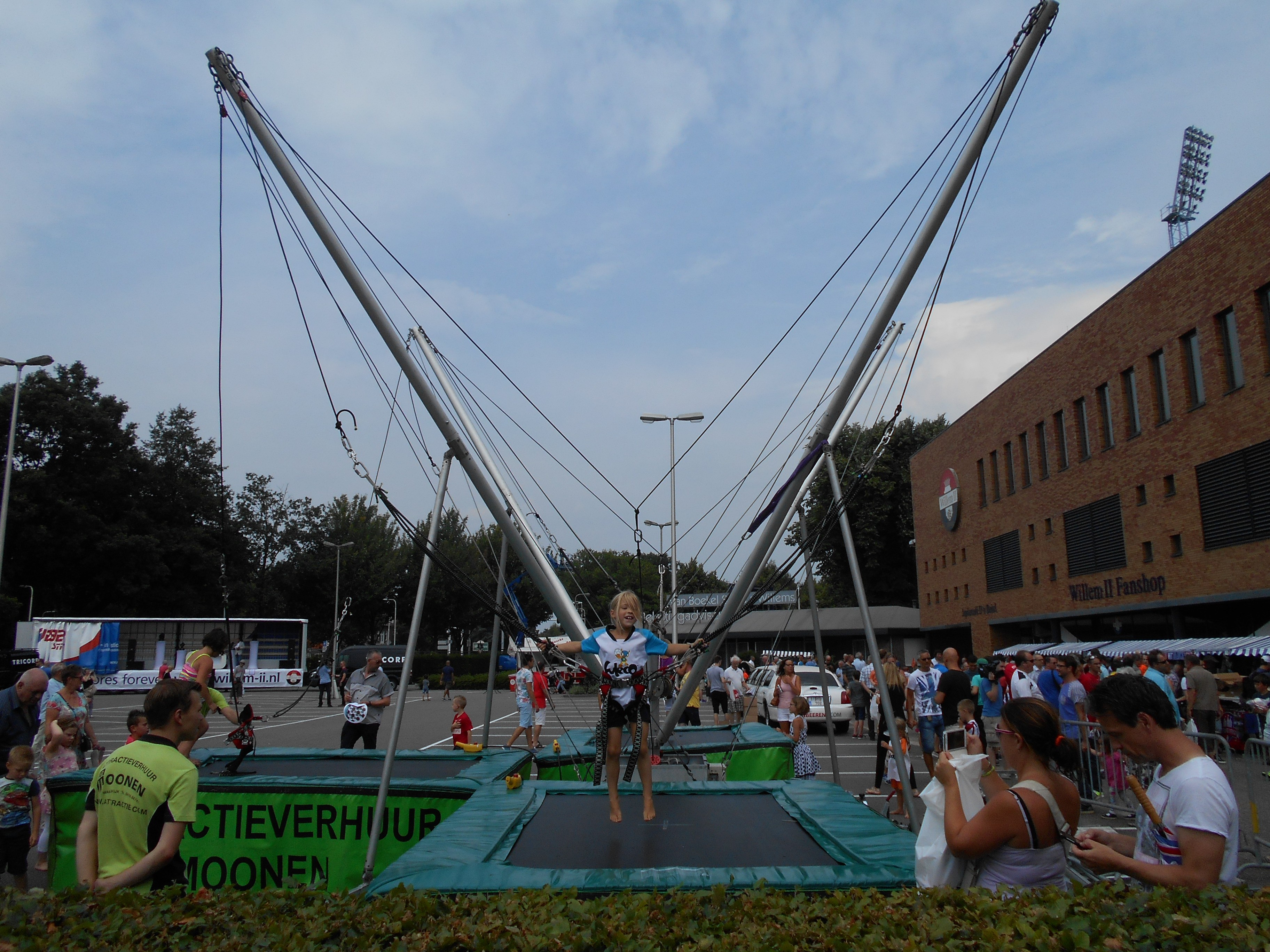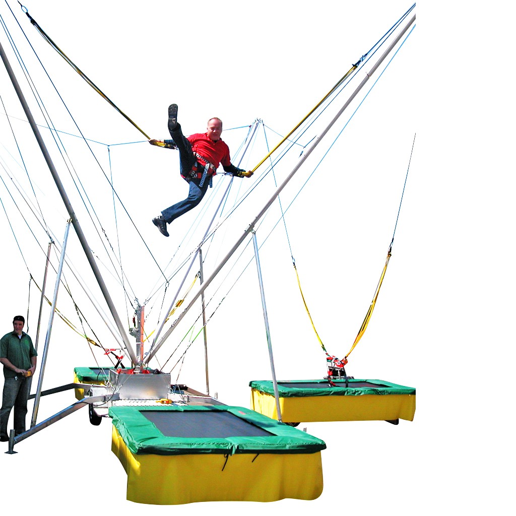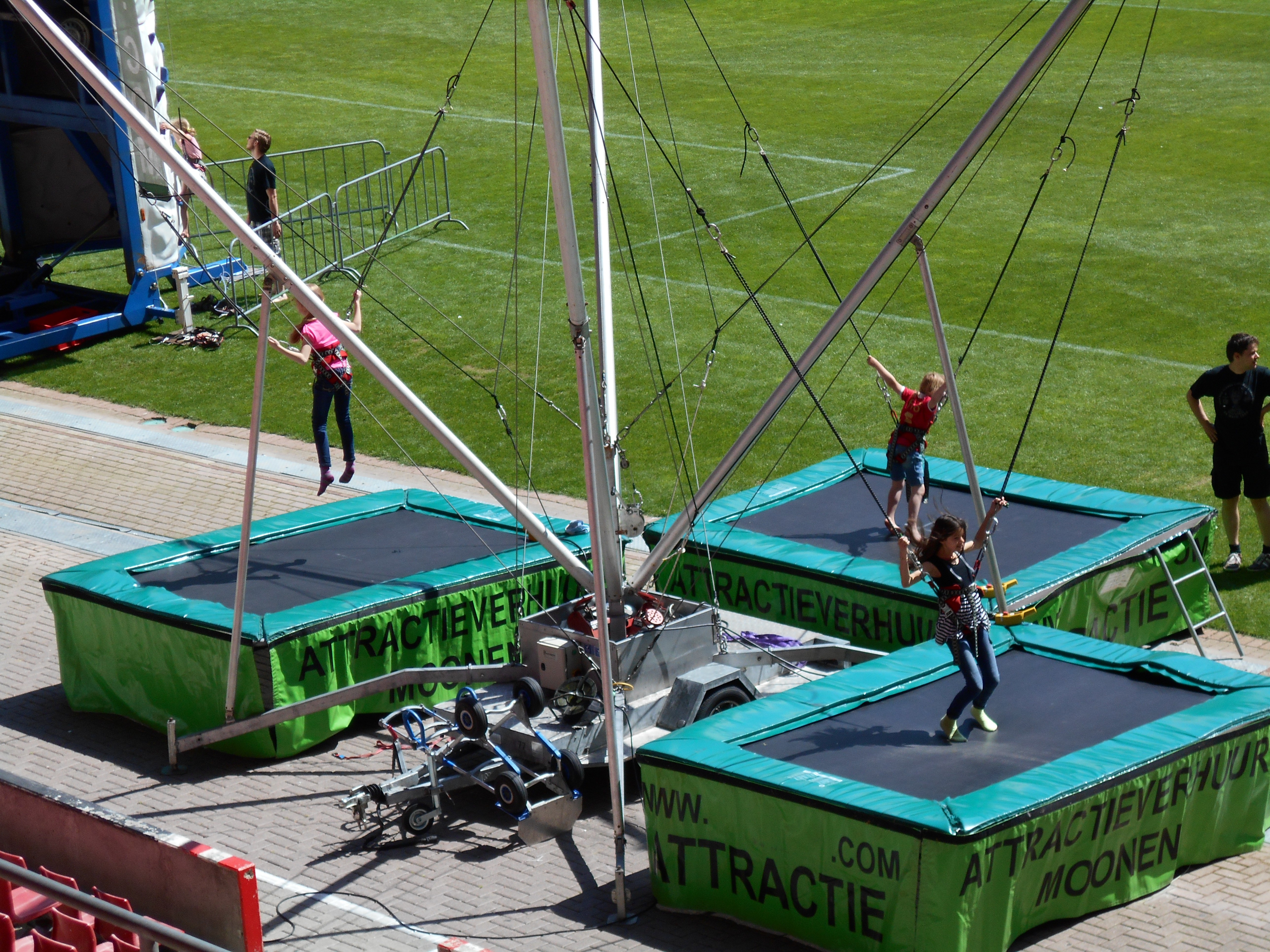 Laat de acrobaat in je los en oefen je geweldige salto’s op deze driepersoons Bungee-trampoline. Door middel van de Bungeekoorden is het super gemakkelijk om tot grote hoogtes te komen. Of je nou bang bent of niet? Vallen op deze Bungee-Trampoline doe je zeker niet! De Bungeekoorden zijn bevestigd aan speciale broekjes waar de deelnemers gemakkelijk in kunnen stappen. Deze broekjes zijn er in alle formaten, dus mogelijkheid tot deelname voor iedereen. De Bungee trampoline is 100% gecertificeerd volgens Europese richtlijnen en wordt ook door ons magazijn vaak en met zorg onderhouden. Echter vanwege specifieke kennis, kwaliteitswaarborg en omdat wij elk evenement tot een succes willen maken is deze attractie enkel te huur op verzorgingsbasis. Fly high and touch the sky met onze Bungee-Trampoline (3-voudig). De attractie wordt met alle plezier verzorgd door ons enthousiast personeel. Uit tientallen jaren ervaring kunnen wij garanderen dat dit een super attractie is, succes verzekerd.