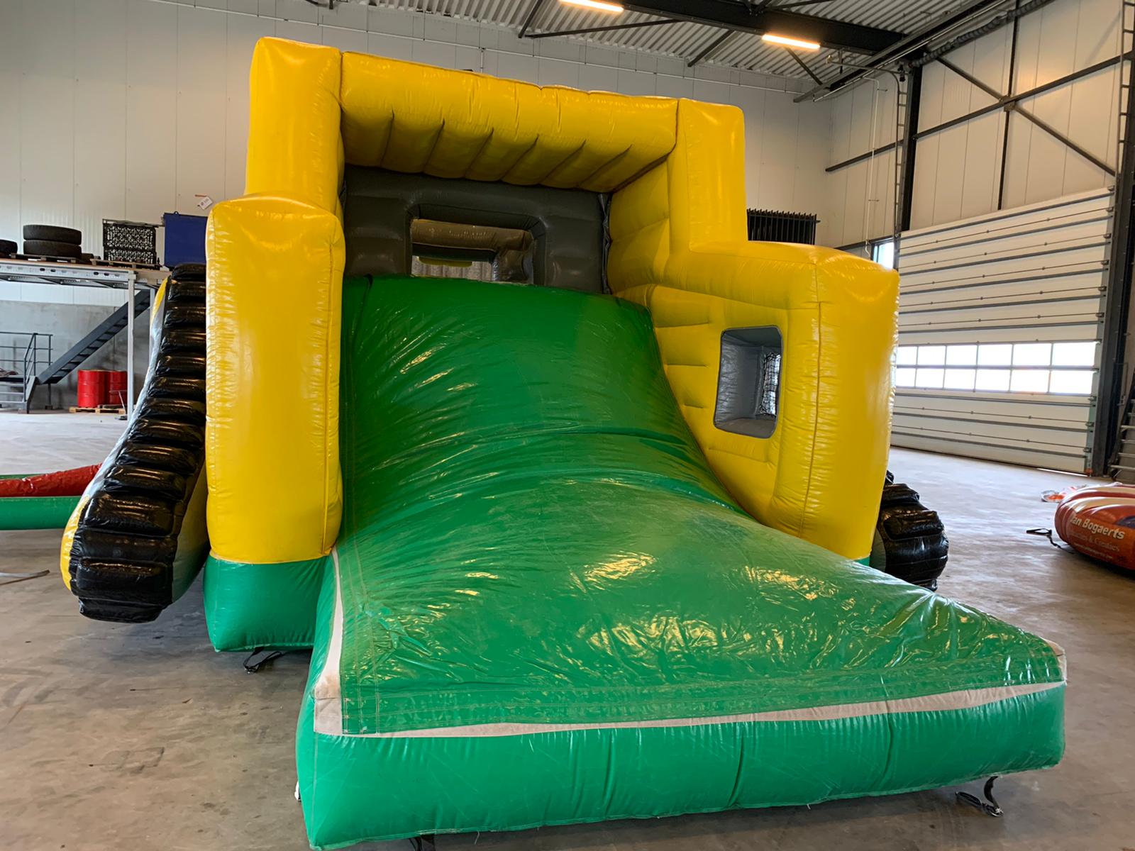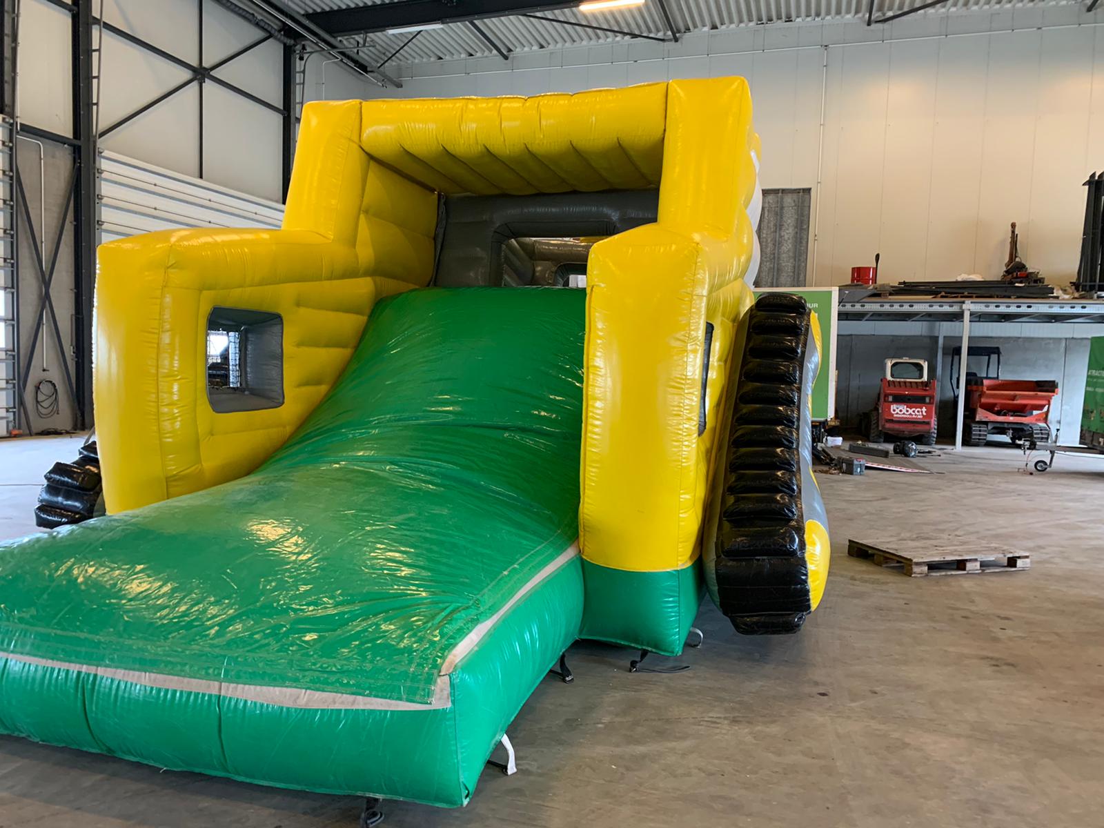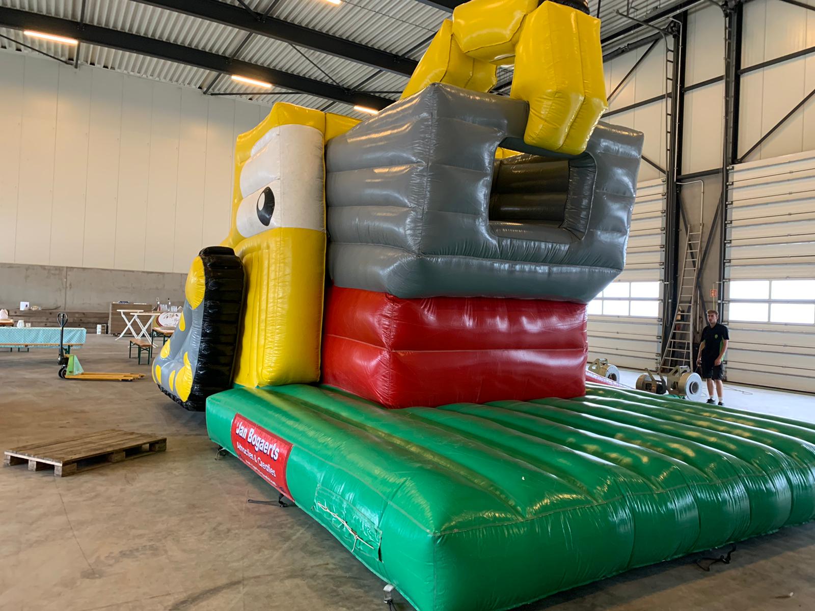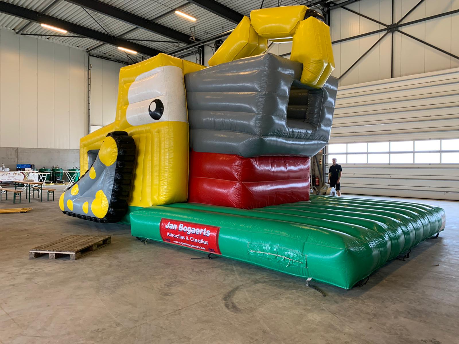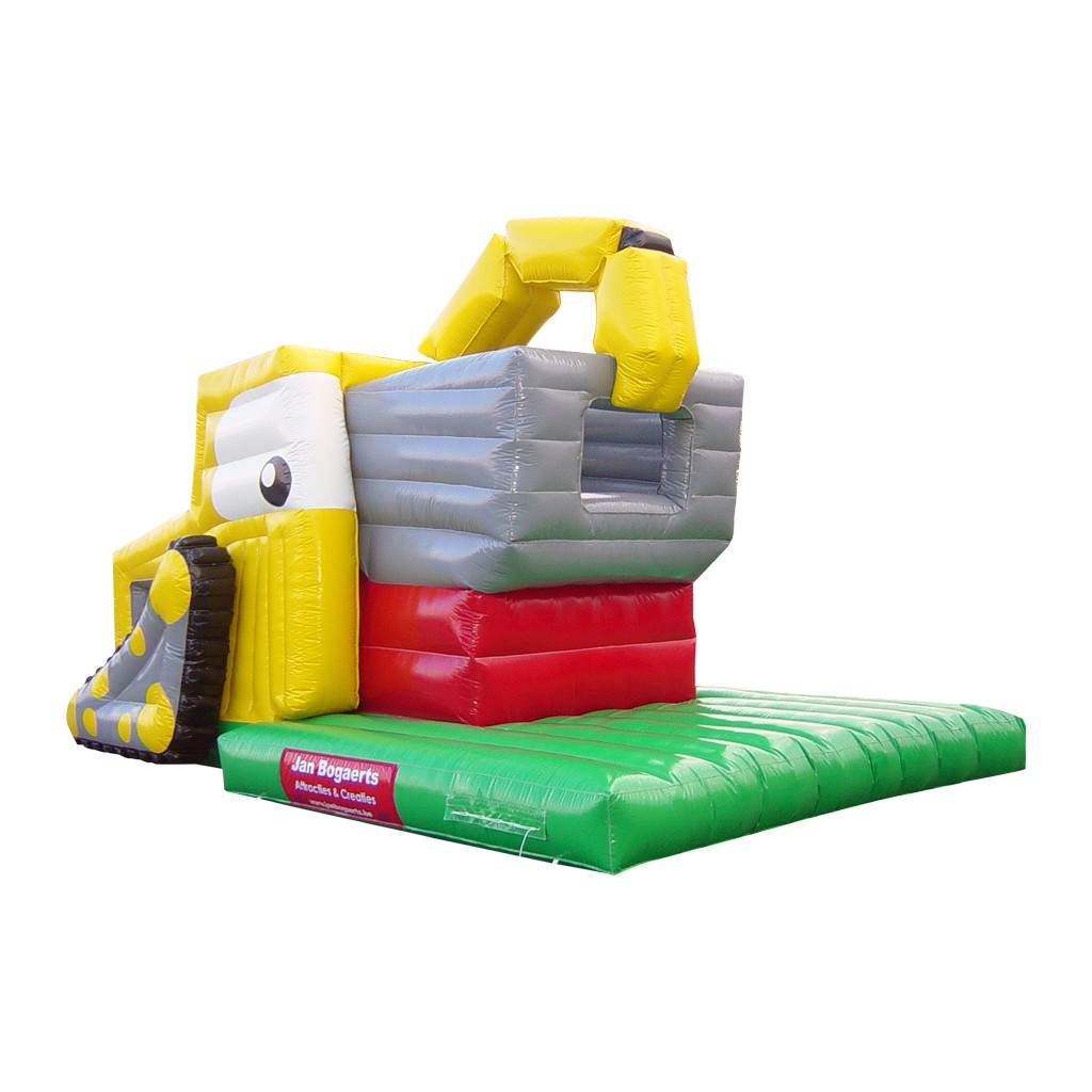 Deze graafmachine zal nooit stoppen met werken. De graafbak blijft maar op en neer gaan. Als de graafbak op zijn laagst is kun je er snel inspringen. Vervolgens gaat de bak weer omhoog waardoor je verder kunt klimmen. Glij vervolgens langs de achterkant weer naar beneden. Dit grote luchtkussen springt in het oog door de felle kleuren en het unieke design.