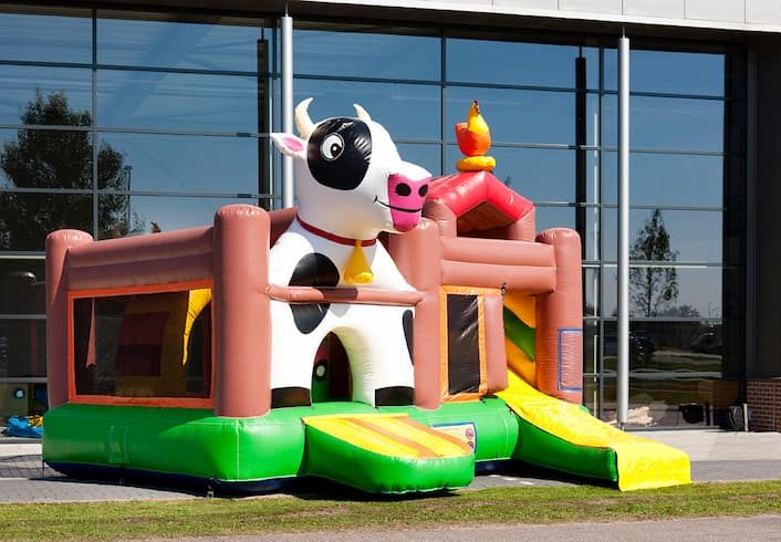 Heb je een evenement of feestje met het thema boerderij centraal staat? Dan is dit dit springkussen de beste keuze! Je komt het springkussen binnen door via de ingang onder de koe aan de voorkant te kruipen. Binnen in het springvlak zijn obstakels geplaatst zoals tunnels en pilaren die zorgen voor urenlangs speelplezier. Als je uit het springkussen wilt kan dit op een leuke en speciale manier namelijk via een glijbaan. Dit zorgt voor gegarandeerd een glimlach en prachtige foto momenten. Ook heeft dit kussen zeer gangbare afmetingen waardoor het op veel gelegenheden gemakkelijk en snel geplaats kan worden. Daarnaast door de hoge zijmuren en de jaarlijkse keuring haal je ook een zeer veilig kussen naar je evenement toe. Dus heeft u een boerderij thema bij uw evenement? Wacht niet langer en huur gemakkelijk en snel de multiplay Boerderij bij attractie verhuur Moonen voor een goedkope prijs.