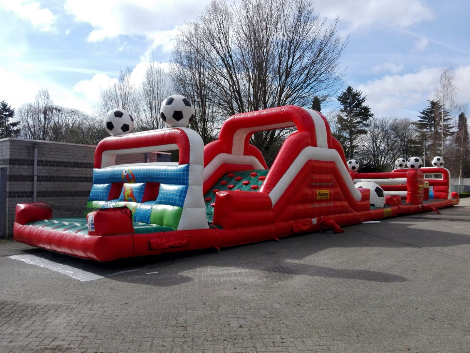 Heb je binnenkort een evenement wat met voetbal te maken heeft of vind je deze stormbaan er gewoon gaaf uitzien? Huur de hindernisbaan voetbal dan voor gegarandeerd veel plezier. Deze hindernisbaan zelf bestaat uit 2 delen maar is gemakkelijk in elkaar te zetten doormiddel van een rijgsysteem wat aan het kussen bevestigd zit. Als je deze attractie in spelvorm gaat gebruiken werkt hij als volgt. Je gaat als eerste het net onder waarna je een klein gat doorspringt. Daarna klim je de steile wand op doormiddel van de blokjes trap en glijd je naar beneden via het glijzeil. Daarna ga je door de voetbaltunnel en via het 2e gat naar de opblaaspionnen. Hier ren je doorheen en spring je door de pilaren heen. Nog even snel onder het net door en je hebt de 30 meter lange hindernisbaan overleeft. Deze attractie is ideaal om te gebruiken als zeskamp spel of gewoon om de mensen lekker te laten springen en klauteren.